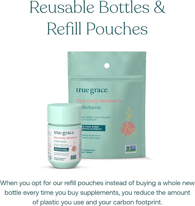 - REUSABLE, RECYCLED PACKAGING - Our commitment to planetary health is real—down to the recycled packaging we use. Our supplements are delivered in reusable bottles made from recycled plastics; and we offer refill pouches of True Grace products.