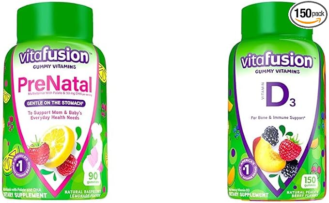 Vitafusion PreNatal Gummy Vitamins & Vitamin D3 Gummy Vitamins for Bone and Immune System Support, Peach, BlackBerry and Strawberry Flavored, 50 mcg Vitamin D, 75 Day Supply, 150 Count