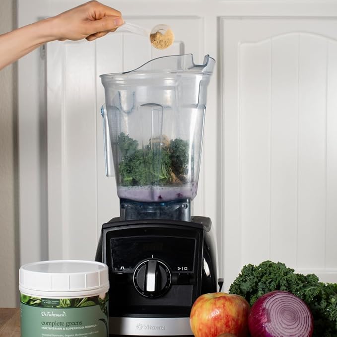 - JUST ONE SCOOP: of Dr. Fuhrman Complete Greens into water or plant milk for an easy and convenient way to get your daily dose of vitamins and nutrient-rich superfoods. Organic fruits and dates give this greens powder a light and sweet taste.