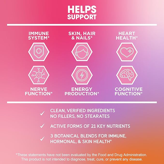 - Energy, Beauty, & Immune Health: Our womens multivitamin supports complete daily wellness for digestion, energy levels, immunity, blood, and heart health. Every capsule promotes radiant skin and nails and supports multiple factors of women’s health.*
