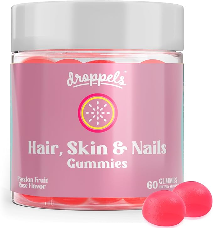 Droppels Hair, Skin and Nails Vitamins Gummies with Biotin 10,000mcg, Vitamin A, Vitamin C, Vitamin E, B6 & B12 | Vegan & Pectin-Based Biotin Gummies, Passion Fruit Rose Flavor, 60 Count