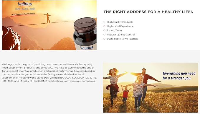 - Validus: We began with the goal of providing our consumers with world-class quality Food Supplement products, and since 2003, we have grown to become one of Turkey's most inventive production and marketing firms. We have produced in modern and sanitary conditions in the facility we established for food supplements, meeting world standards. We hold ISO 9001, ISO 22000, ISO 22716, ISO 13485, and Ministry of Health GMP certifications from approved companies