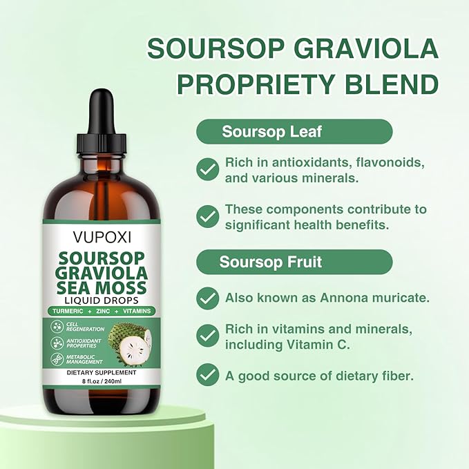 - Superfood Extract Soursop Liquid: Soursop bitters Liquid Drop is a extract 240ml made from soursop (graviola) leaves,Sea moss extract and Turmeric extract. A superfood rich in vitamins and dietary fiber, 【NOTE 】the 'Soursop 6:1' means the proportion of soursop itself and its extract is 6: 1 equivalent to 6000mg of Graviola leaf. Sea Moss 10:1 extract equivalent to 3000mg of Sea Moss.