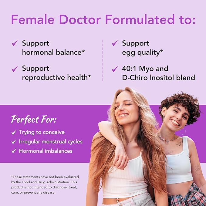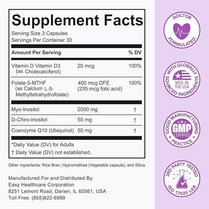 - Premium Ingredients: Carefully formulated with 2000mg Myo-Inositol, 50mg D-Chiro Inositol, Coenzyme Q10 (Ubiquinol), Folate (400 mcg DFE), and Vitamin D3. These high-quality ingredients work in harmony to support your body’s natural hormonal balance, promoting ovarian function and menstrual cycle regularity
