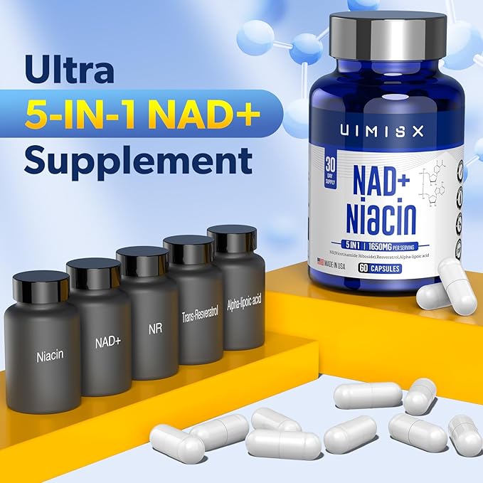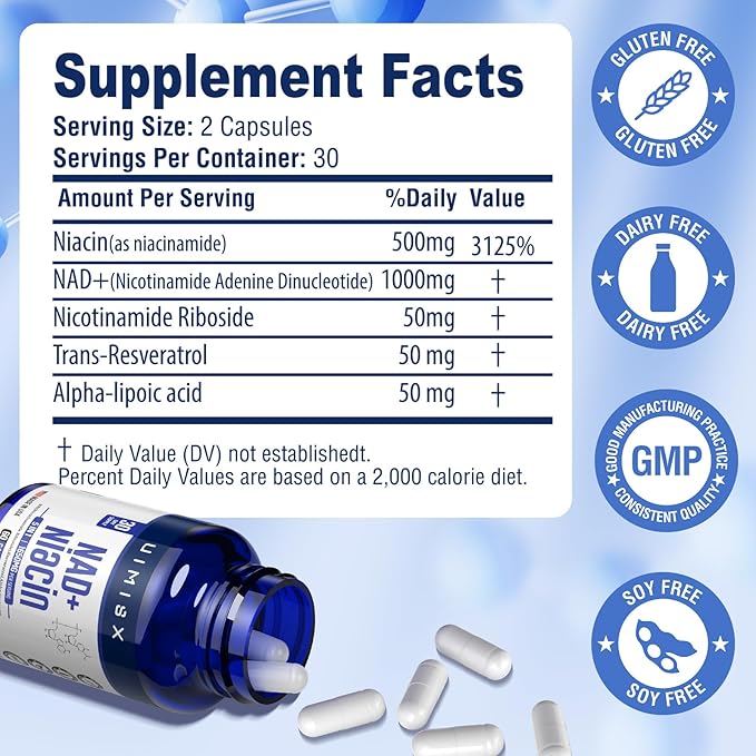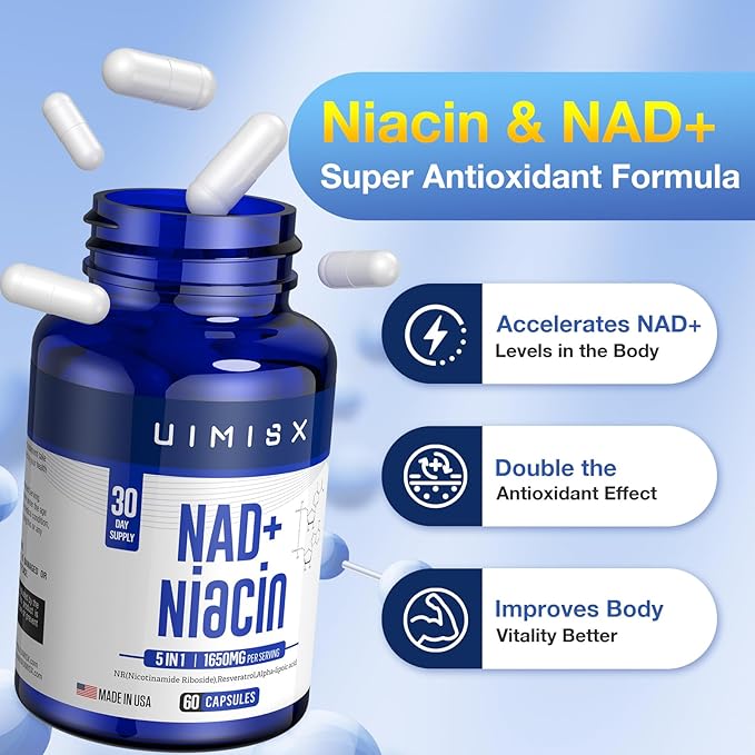 - Cellular Boost - Reveal the hidden potential of your cells with our NAD + and Niacin Capsules. Our top-grade formula packs a powerful 1000mg NAD + and 500mg Niacin, 50mg NR(Nicotinamide Riboside), 50mg Resveratrol, 50mg Alpha-lipoic acid per serving, giving your cellular health and overall well-being the essential support they need. Each bottle contains 60 capsules, providing you with a 30-day supply of this mighty supplement.
