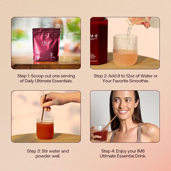- HOW TO ENJOY IM8: For a perfect serve, mix one level tablespoon (12g) of IM8 Daily Ultimate Essentials into 8-14 oz of water, juice, or your favorite drink. Mix thoroughly, then sip and enjoy the smooth acai and mixed berries flavor with earthy undertones and a subtle tart finish. IM8 is designed to fit seamlessly into your routine—whether it’s your morning ritual, post-workout recovery, or a midday reset. Enjoy IM8 daily with 92 powerhouse ingredients, all in one refreshing drink.