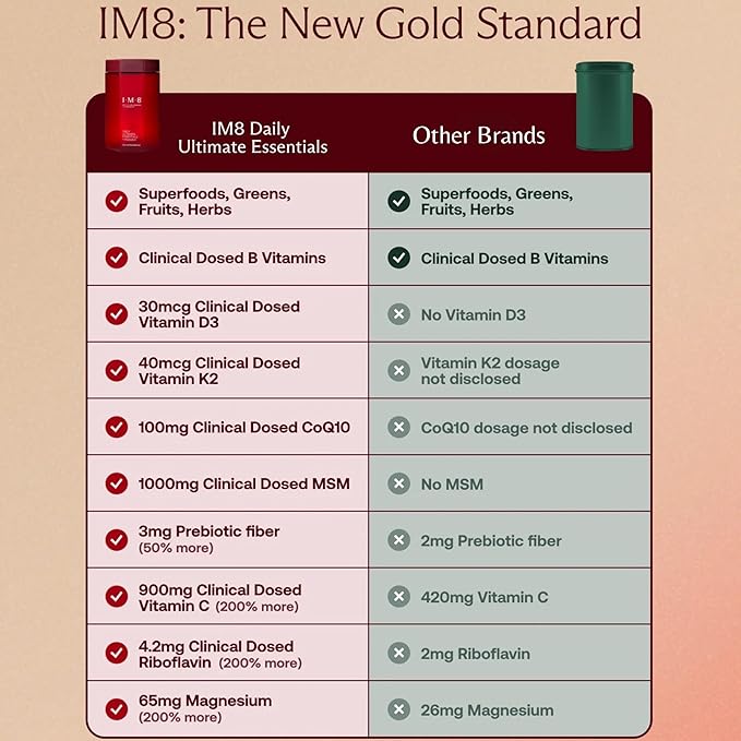 - DAILY ULTIMATE ESSENTIALS: Your daily foundation for energy, focus, digestion, and whole-body wellness support—in one delicious and easy-to-mix drink. IM8 Daily Ultimate Essentials is a science-backed, all-in-one supplement for men and women designed to simplify daily nutrition with a science-backed formula. With 92 nutrient-rich ingredients, including essential vitamins, minerals, superfoods, and clinically studied doses of CoQ10 and MSM, IM8 supports hydration, digestion, energy metabolism, immune function, and overall well-being, including key nutrients for hair, skin, nails, joints, muscles, and heart health.