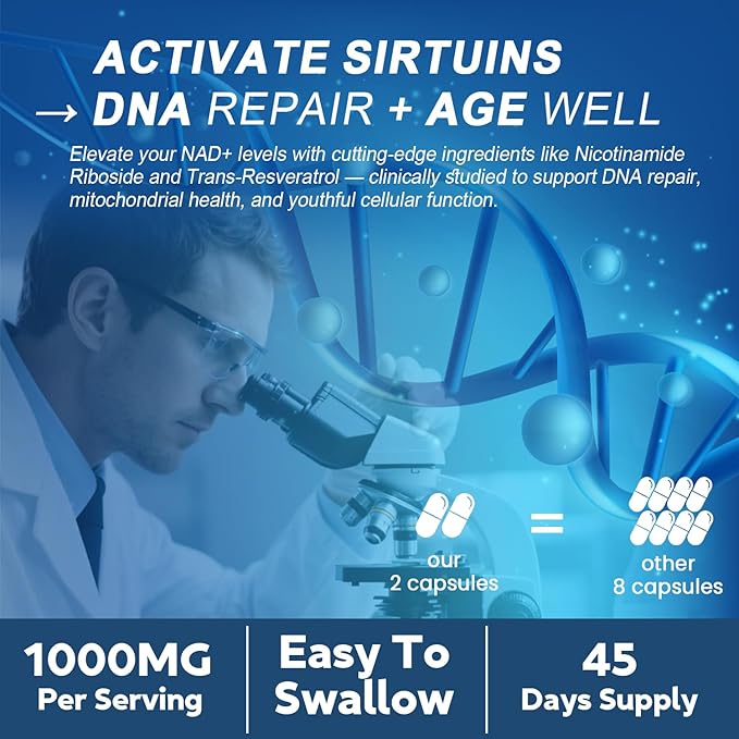 - SUPPORTS HEALTHY AGING – As we age, NAD+ levels naturally decline, contributing to fatigue, slower recovery, and decreased vitality. Our pure NAD+ Resveratrol supplement is specifically designed to restore NAD+ levels, potentially increasing them by up to 67%. This boost helps your body combat tiredness, improve energy, and support healthy aging from within.