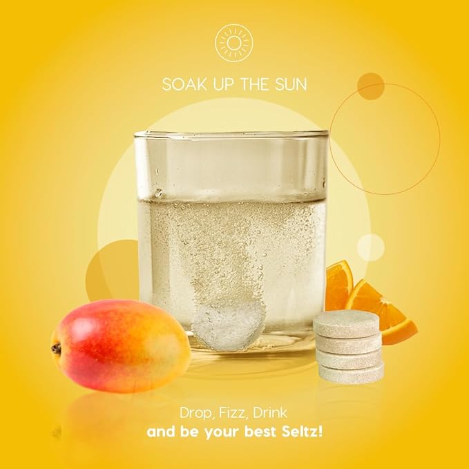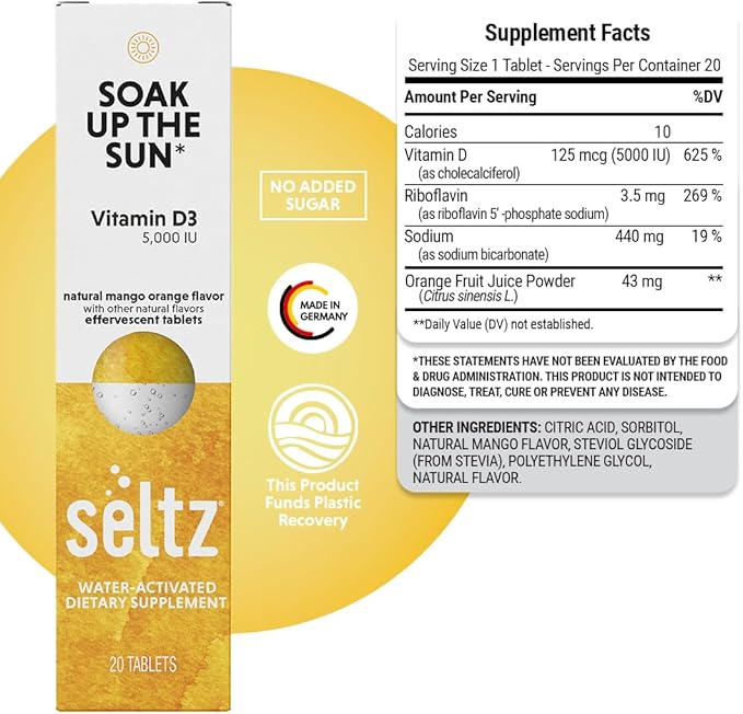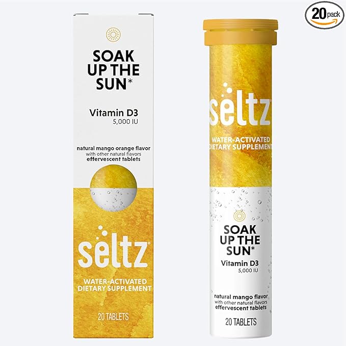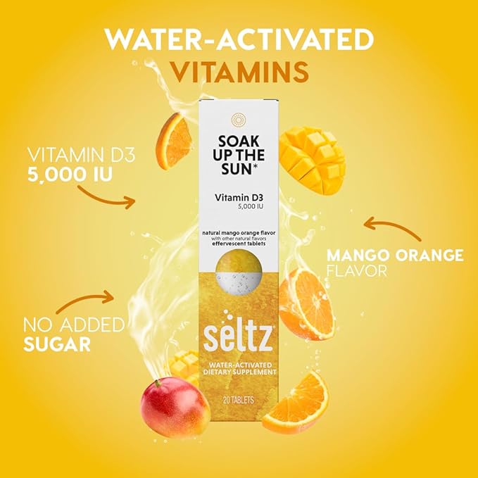 Seltz® Water-Activated Vitamins - Soak up The Sun with Vitamin D3 (5,000 IU) – Natural Mango Orange Flavor Dietary Supplement - 20 Effervescent Tablets
