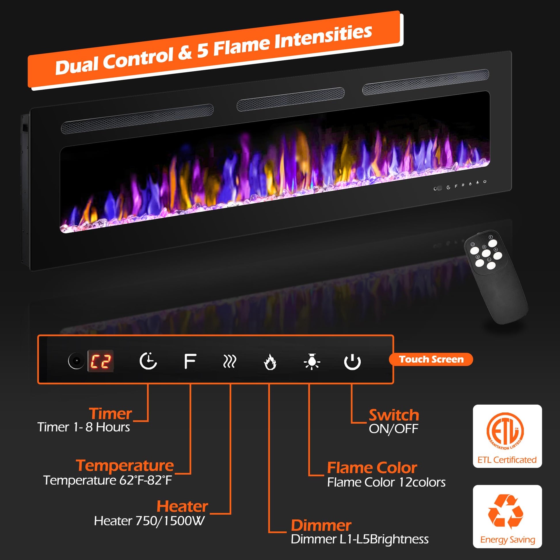 - SPECIFICATION : Dimension 60'L*17'W*4'D, 750W/1500W Heat setting; Package include -1x electric fireplace, 1x carbon log, 1 pack crystal stone, 1x installation manual and hardware accessories.
