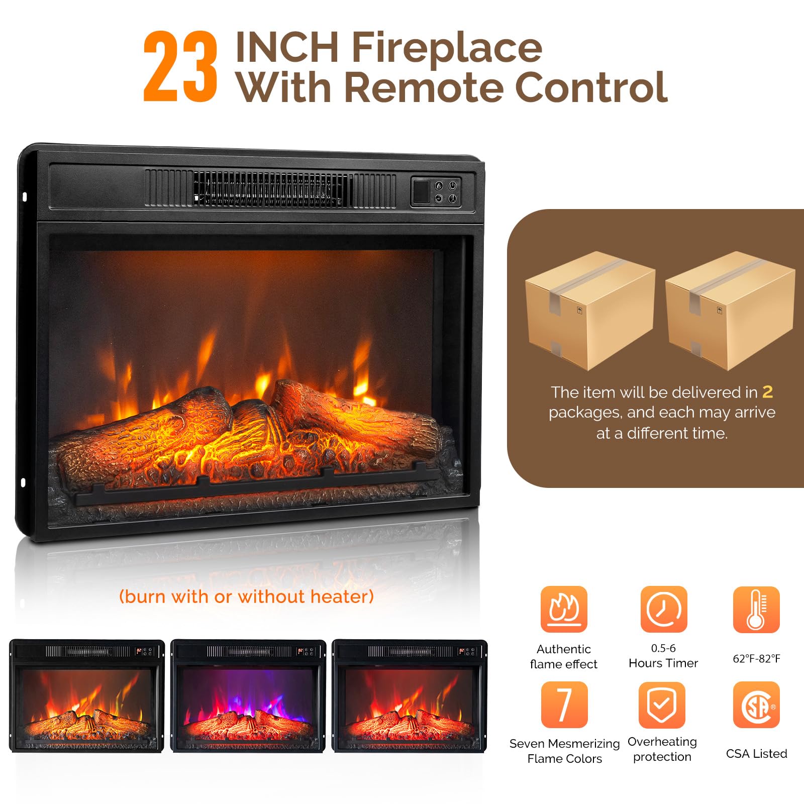 - Realistic 23' Built-In Electric Fireplace: Featuring a 24.17'W x 5.08'D x 17.52'H built-in fireplace heater, this console provides a captivating flame display and adjustable warmth, with temperatures ranging from 62°F to 82°F. Easily control flame, heat, and timer (0.5-8 hours) settings with the touch buttons or included remote, creating a warm, inviting ambiance