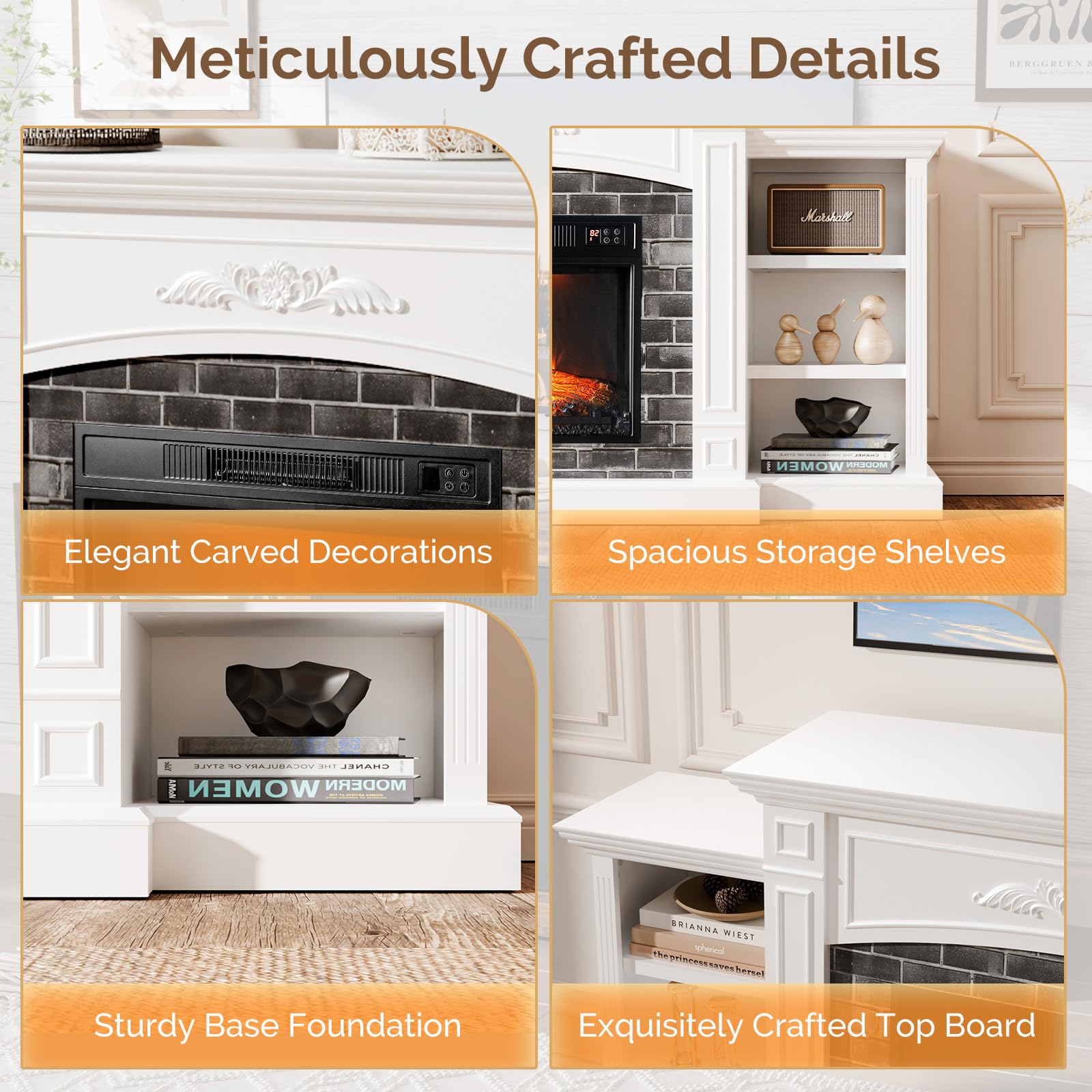 Bonnlo 80'' Fireplace TV Stand for 90'' TVs, Farmhouse Modern Electric Fireplace with Mantel, Media Entertainment Center Console Table with Ample Storage & Adjustable Shelves, White