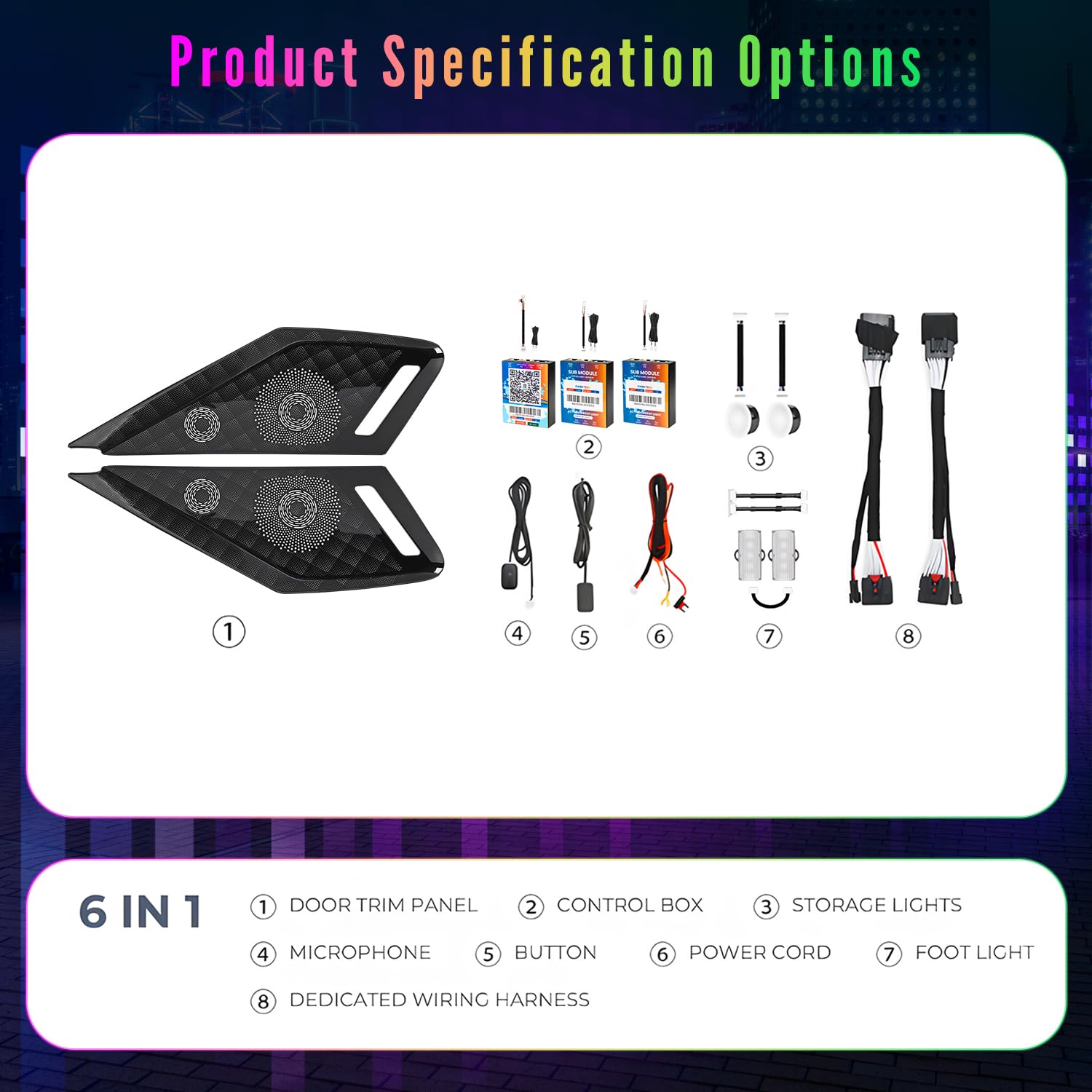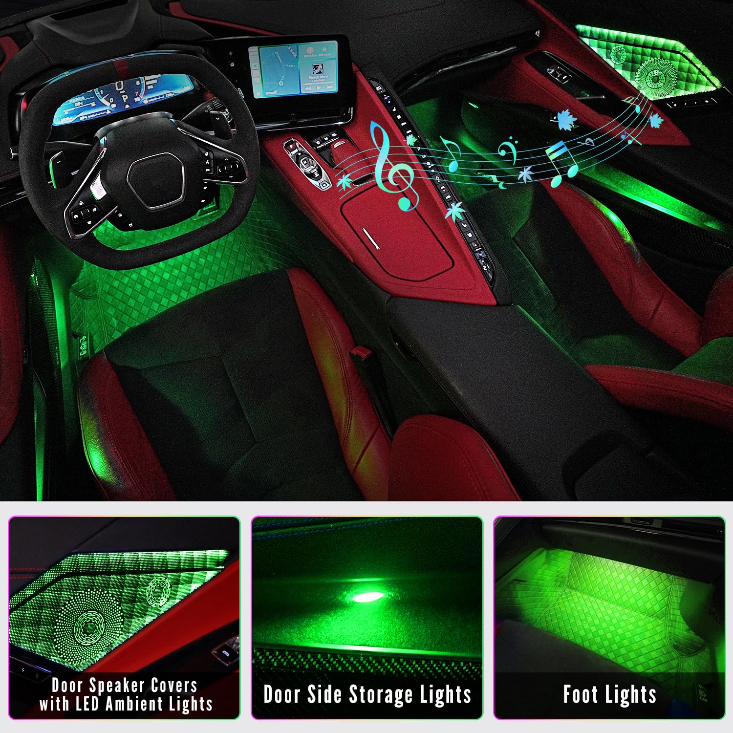 - Three Part Ambient Lights: This LED interior atmosphere lighting kit comes with 2 piece flashing A pillar door speaker panel with lights (pre-cut for memory seat buttons cover only); 2 pieces footwell lights for the driver and passenger sides;and 2 pieces lights for the door storage compartments.Total 6 pieces LED ambient Lights in a kit.This LED ambient light kit features 64 multicolor options and a music sync mode, allowing the colors and speed to change with the rhythm of your music, enhancing your driving experience with a touch of fun.