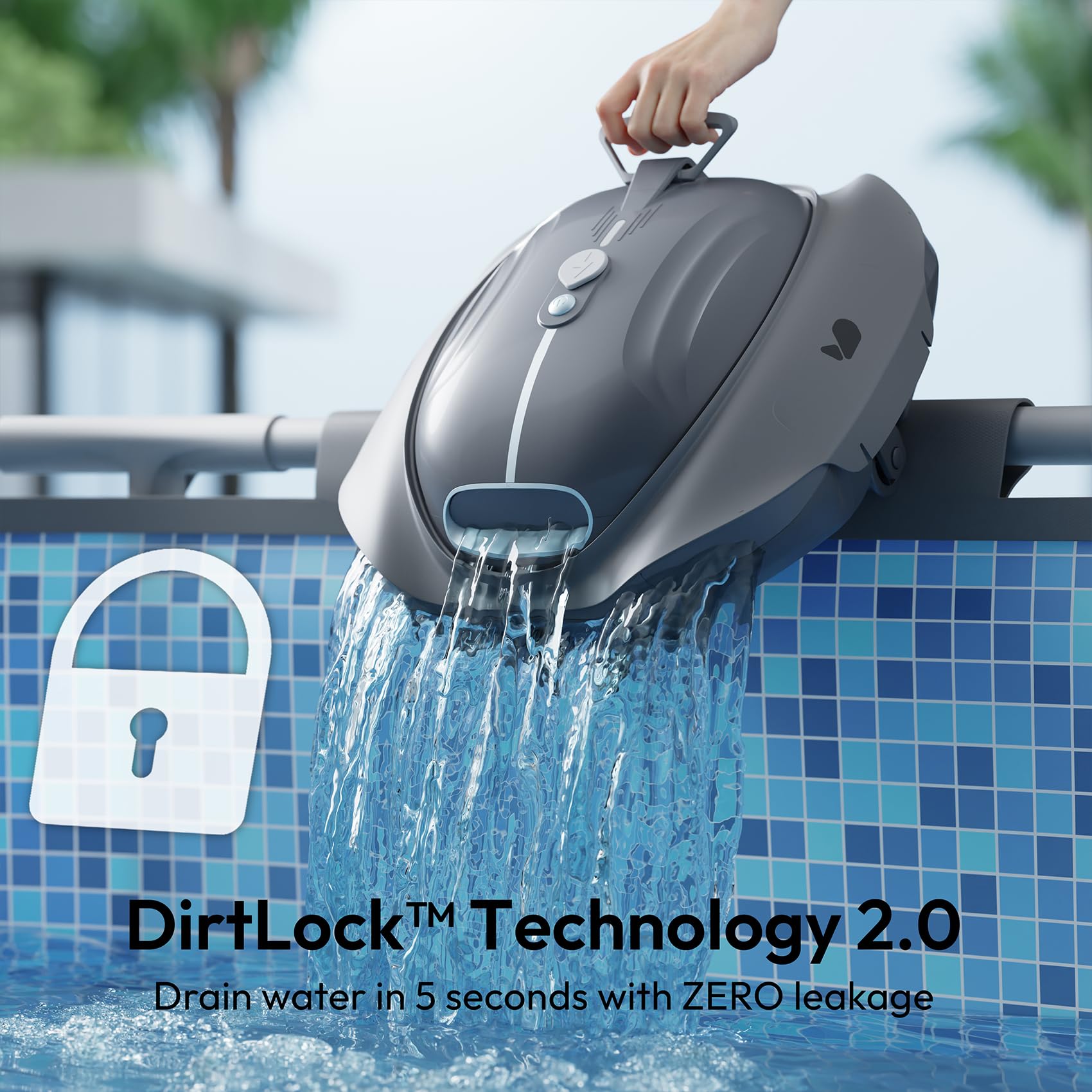 - DirtLock Tech 2.0 – No Mess, No Spills: Our leak-proof DirtLock Tech 2.0 securely traps debris—fine sand, leaves, and more—when lifting the cleaner out of the pool. The improved drainage system empties stored water in just 5 seconds, making post-cleaning hassle-free.