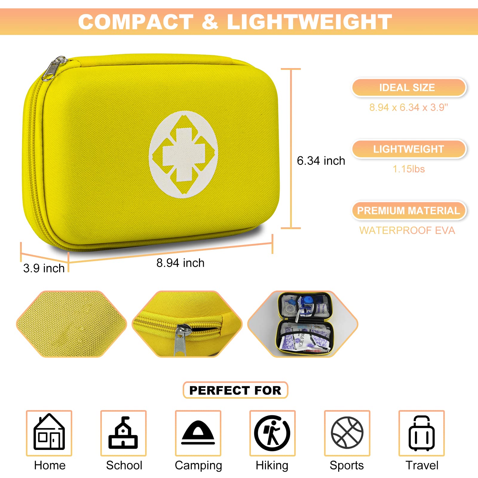 - ☙ Be Prepared for Activities Situation☙ The yellow first aid kits travel-size suitable for most emergency situations. Great emergency car first aid kit essentials for most daily use or adventures, including homes, offices, sports, boats, workplace and schools. Be ready for unexpected emergency situations.
