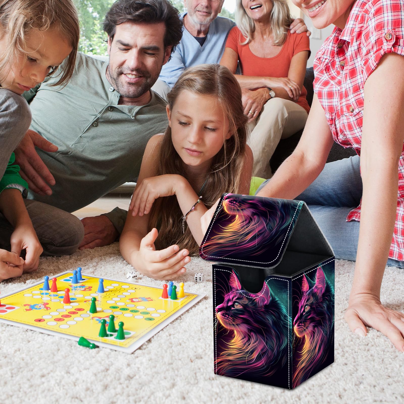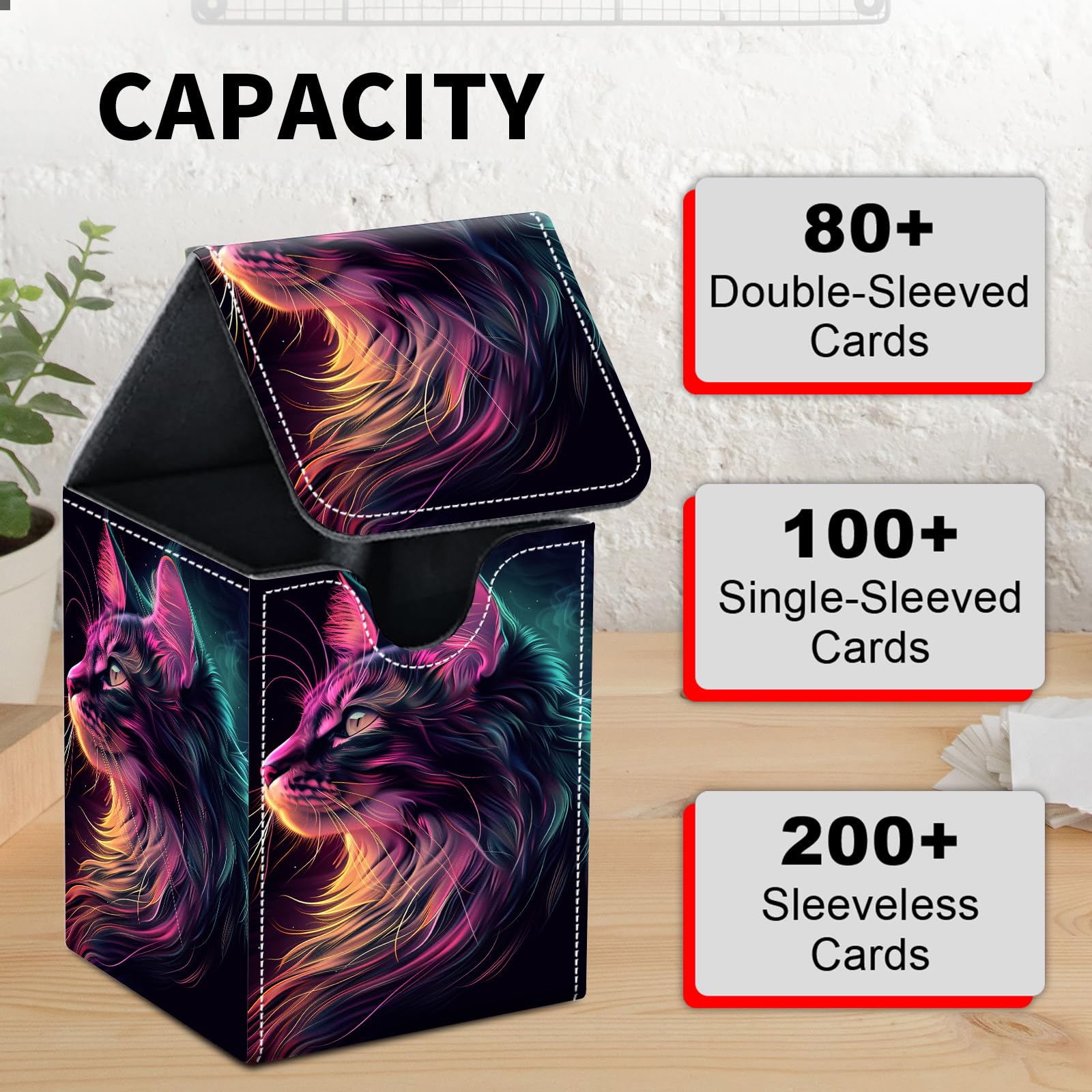 Card Deck Box for MTG Trading Cards, Magic Card Box Can Hold 110+ Single Sleeved Cards, Waterproof PU Leather Material, Strong Magnetic Buckle Card Set Box Suitable for TCG CCG, Neon Colored Cat