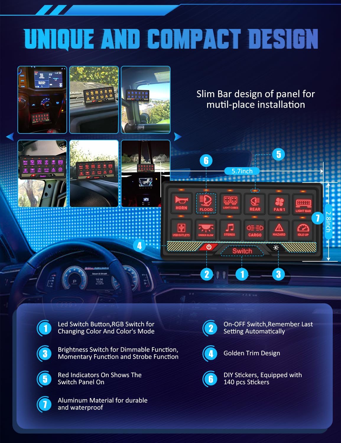 - Unique And Compact Design: The new style RGB switch panel are with gold trim and led backlight change switch on bellowing edge, change the color of switch panel to match with your interior light. The 12 gang switch panel size is 5.7’’ x 2.8’’x 0.5’’, more slim than P1 switch panel, suitable for any place installation.