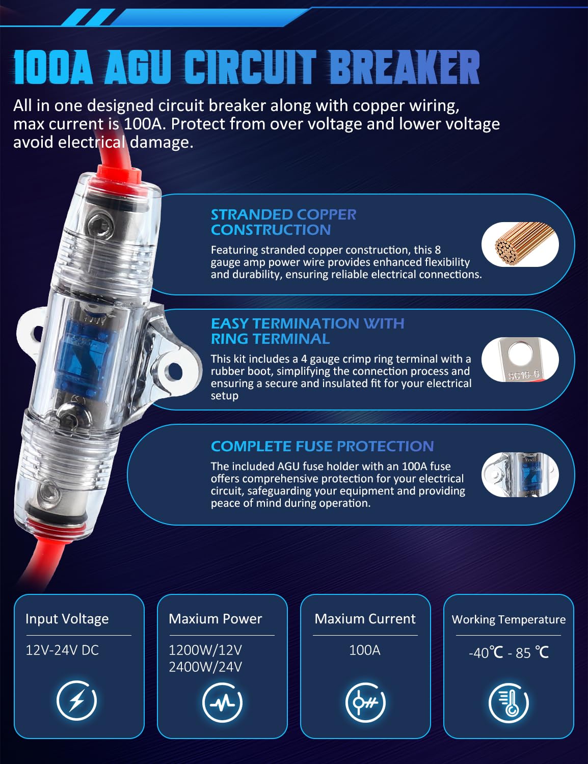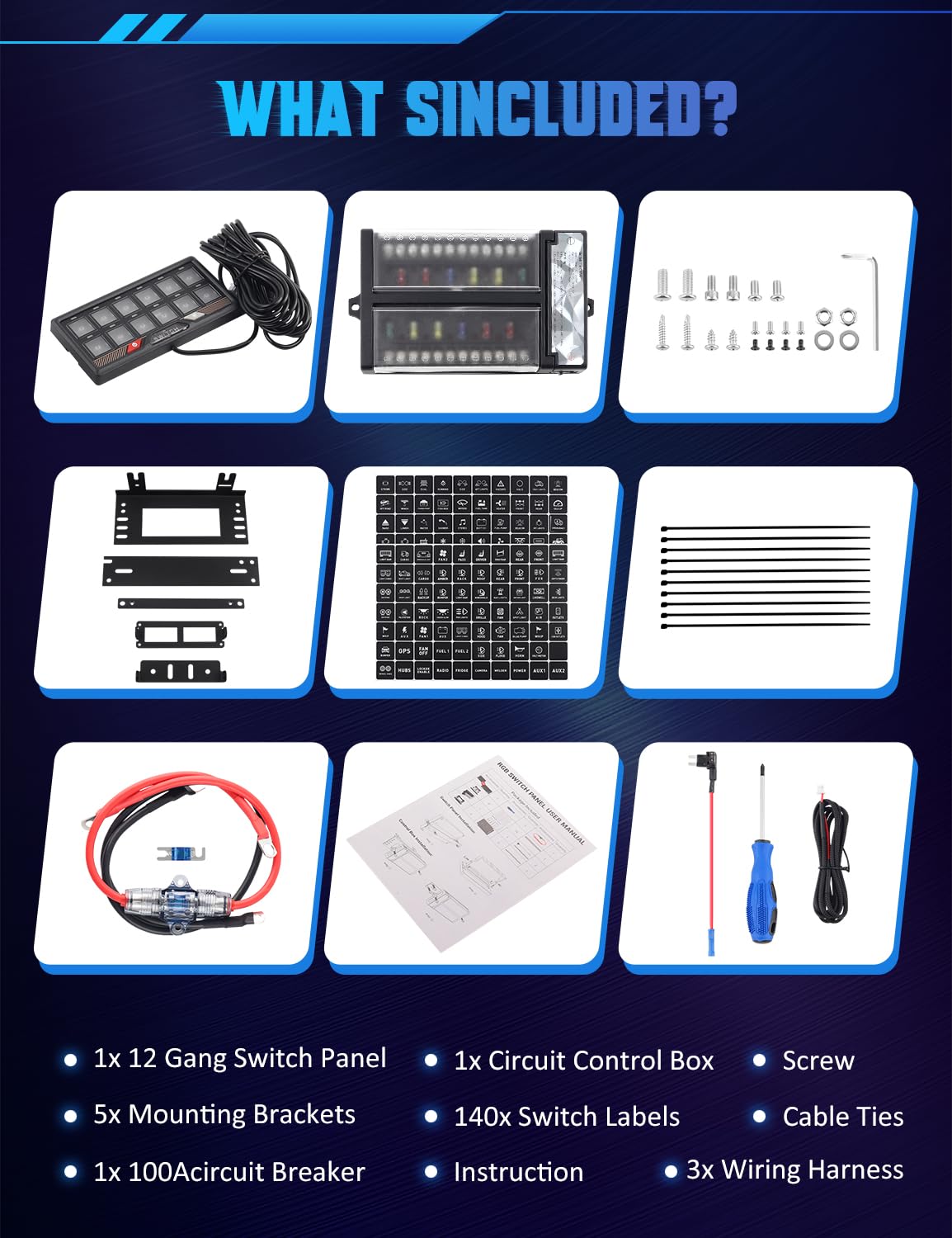 - Add More Protection: New 12 Gang Switch Panel equipped with AGU fuse holder with an 100A fuse and copper wiring protects from over voltage and lower voltage avoid electrical damage. And there is protection cover for battery wiring connecting, improve the waterproof level so that it is ideal for on- or off-road vehicles