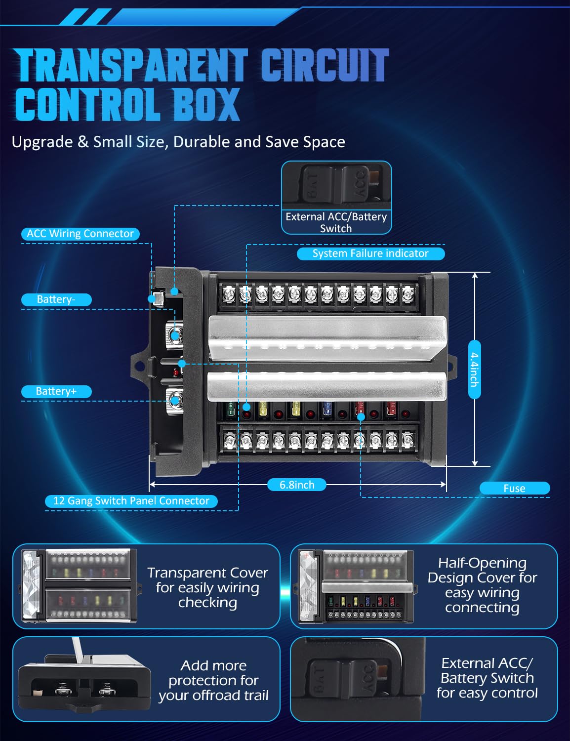 - Easy To Operate: Control box of switch panel kits is upgraded to half-opening transparent cover, which is divided to 3 parts, you can easily connecting the accessories wiring, and check the fault without lift the cover. External ACC/Battery Switch is designed for easy changing the controlling way of switch panel