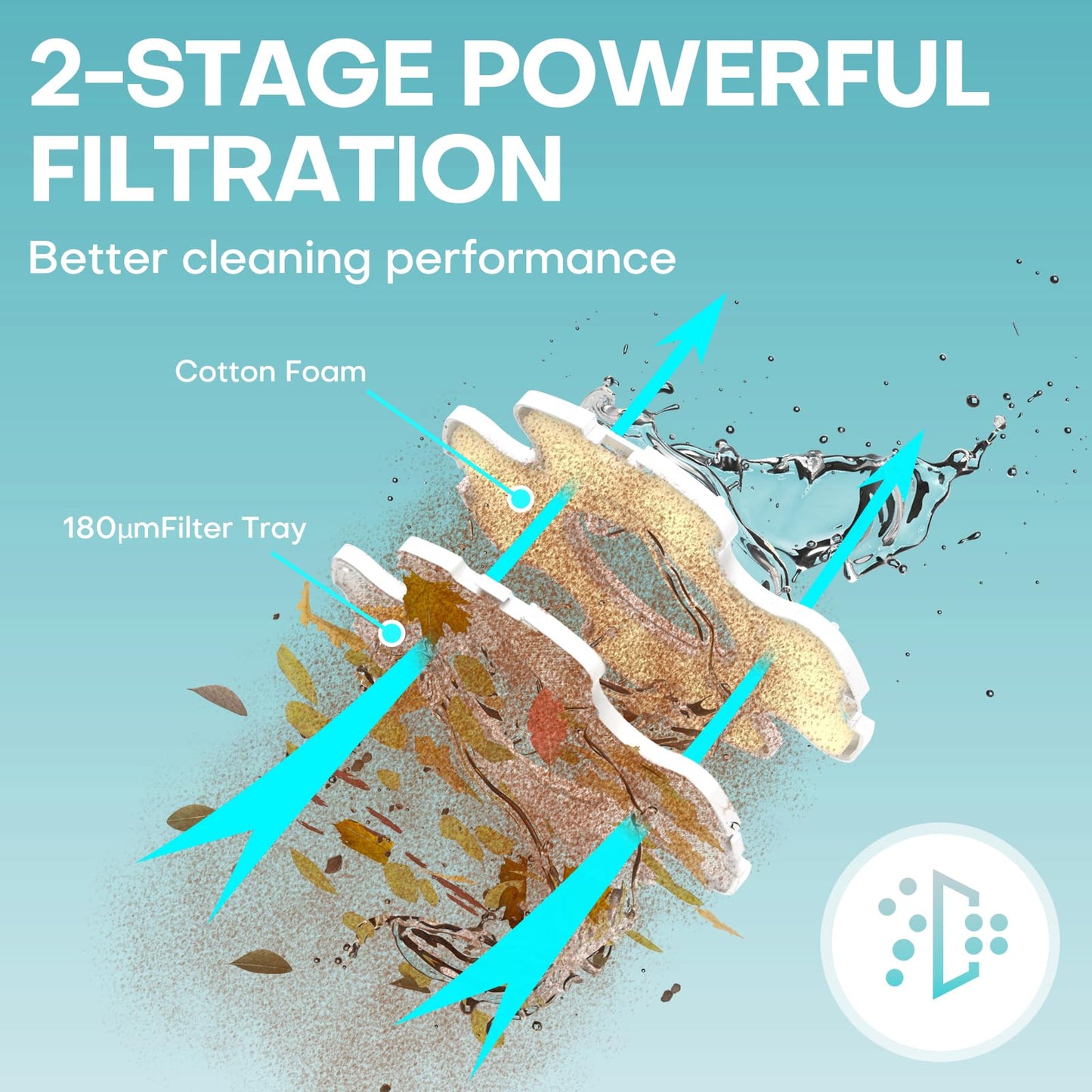 - Exceptional Dual-Layer Filtration System:This above ground pool vacuum features a rare dual-layer filtration system, combining a 180μm filter with a textured foam layer to enhance filtration efficiency by 50%—setting it apart from conventional pool vacuum robot.This pool cleaner effectively captures various debris, including fine leaves, sand, and more, ensuring superior pool cleanliness.Note: For heavily soiled pools, clean the filter every 30 minutes to prevent clogging and potential damage.