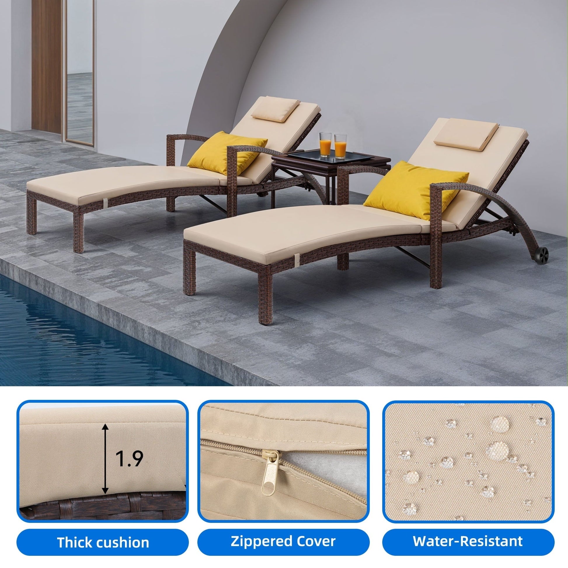Dextrus 2 Pcs Outdoor Chaise Lounge Chairs, Rattan Wicker Patio Pool Loungers with Cushion & Adjustable Backrest, Arm, Pillow, Wheels