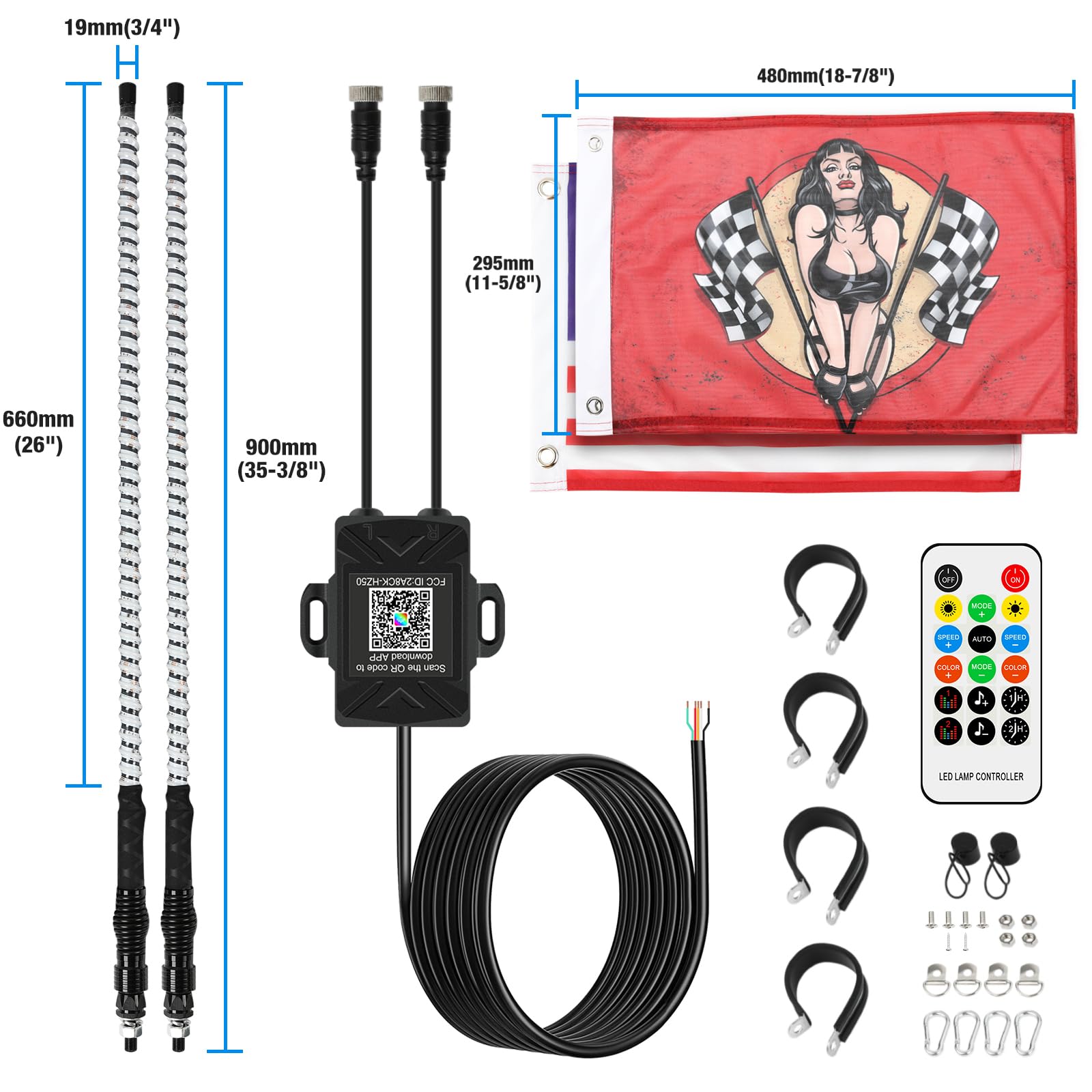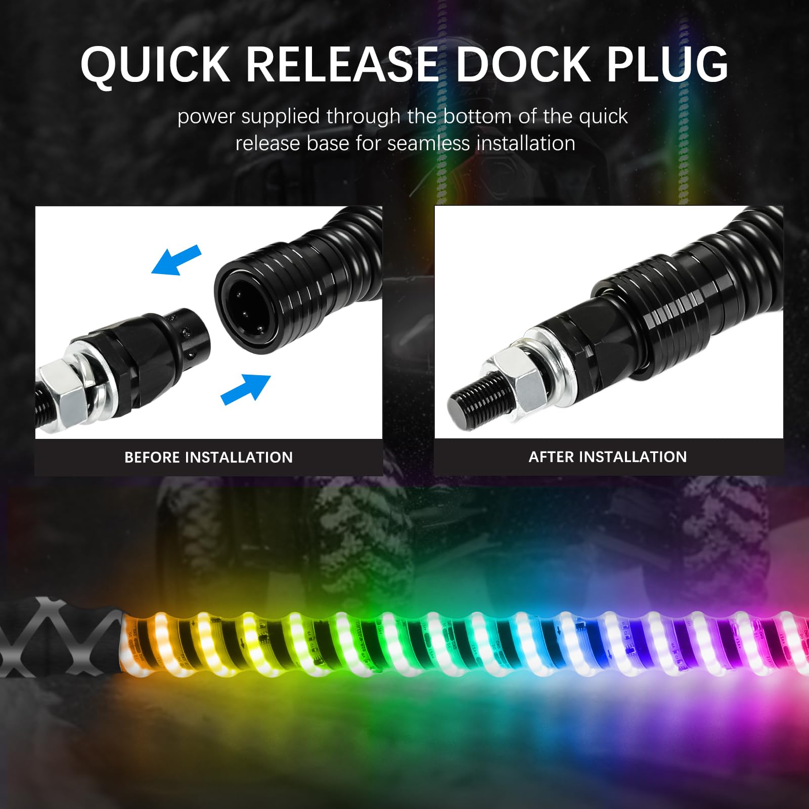 - ๐๐๐ฌ๐ฒ ๐ญ๐จ ๐๐ง๐ฌ๐ญ๐๐ฅ๐ฅ - Sliding the quick disconnect base 'UP' to release, then drill a hole to tighten the LED whip, connect the battery wire, finally you can control it by just controlling a remote controller. Make installation even easier with the included installation guide and accessories.