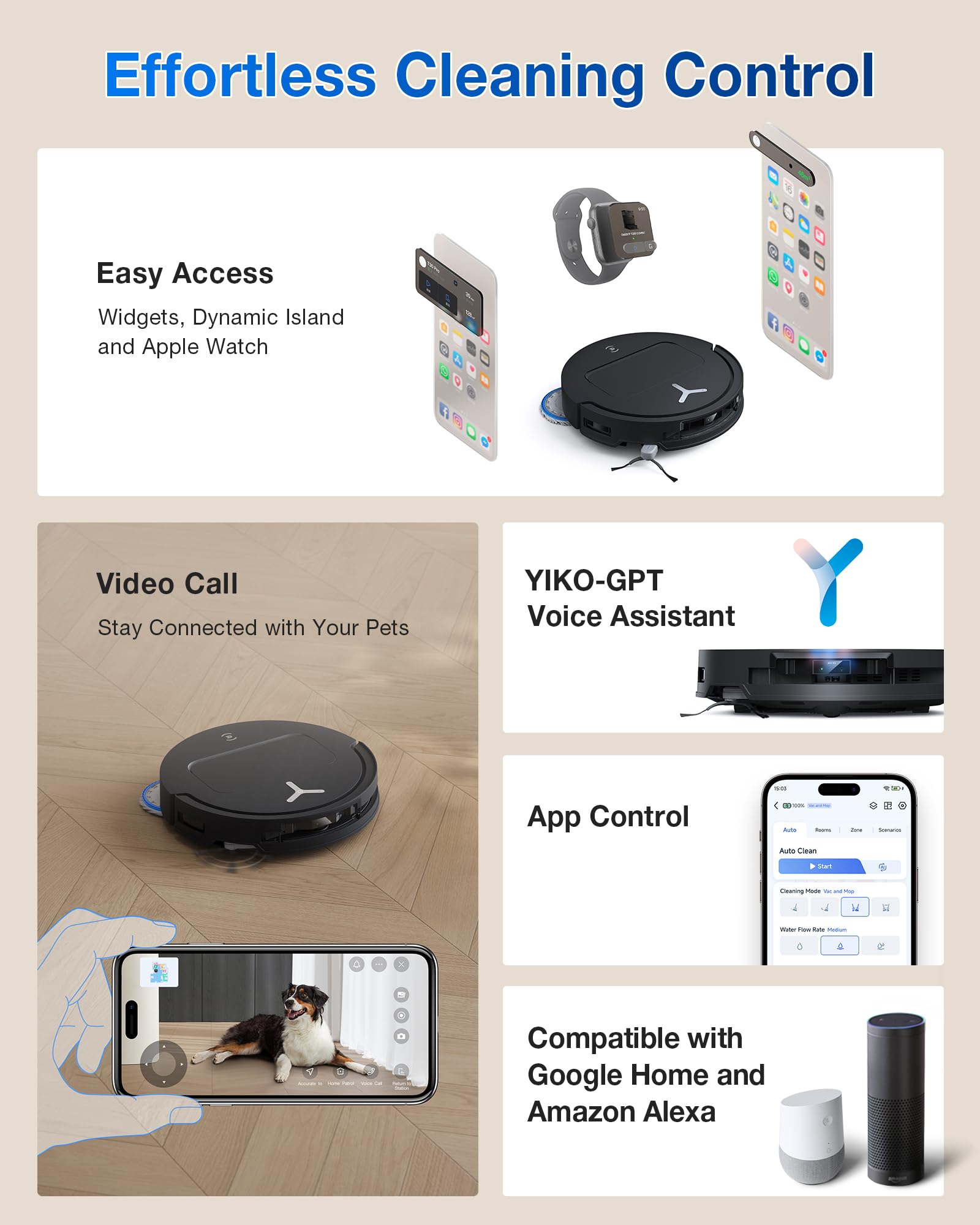 - SMART CONTROL WITH YIKO-GPT AI ASSISTANT - The YIKO-GPT AI Assistant enables natural voice and text commands, allowing you to control cleaning with ease. Whether through simple voice prompts or long-form interactions, YIKO-GPT understands your needs and responds intelligently, making home cleaning effortless.