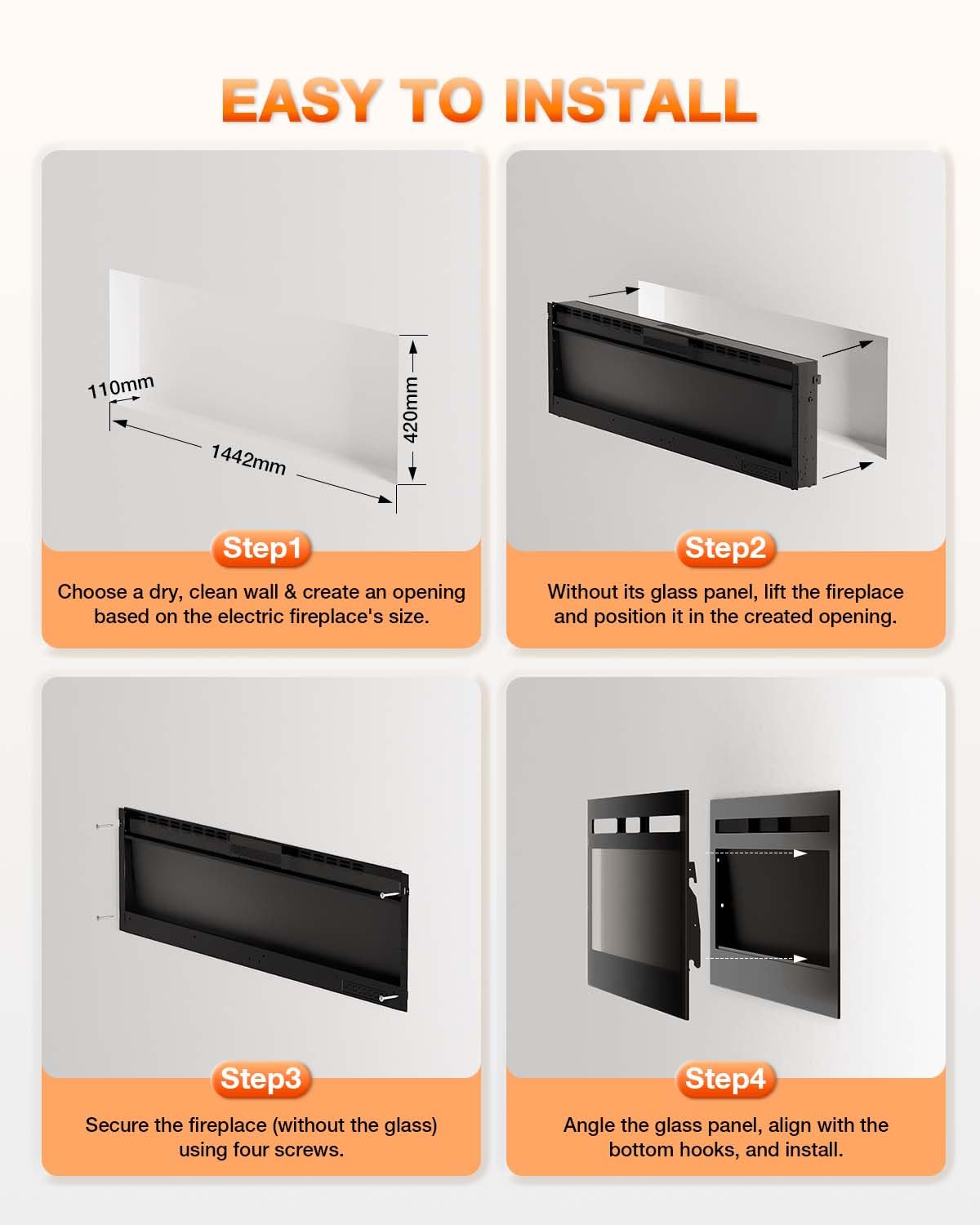 - Easy Installation: We offer various installation methods, including wall-mounted, built-in, and free-standing, to cater to different needs. The product comes with a clear instruction manual, and with simple steps, you can complete the entire installation within an hour.Then, sit back with your loved one and enjoy the lifelike flames