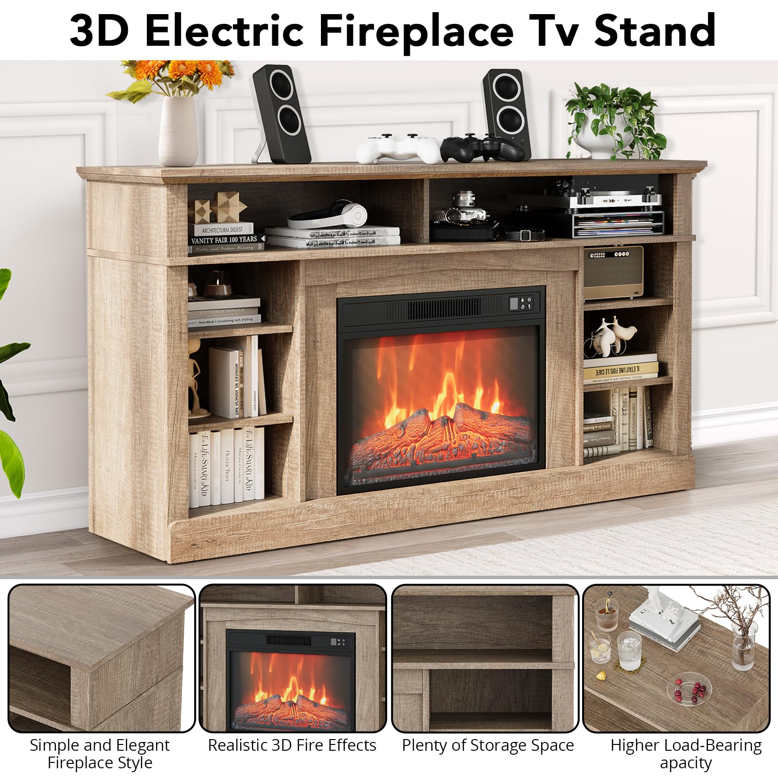 - Accommodates Up to 58' TVs: This farmhouse electric fireplace TV stand is designed to perfectly fit TVs up to 58 inches, blending functionality with rustic charm, making it an ideal centerpiece for your living space.