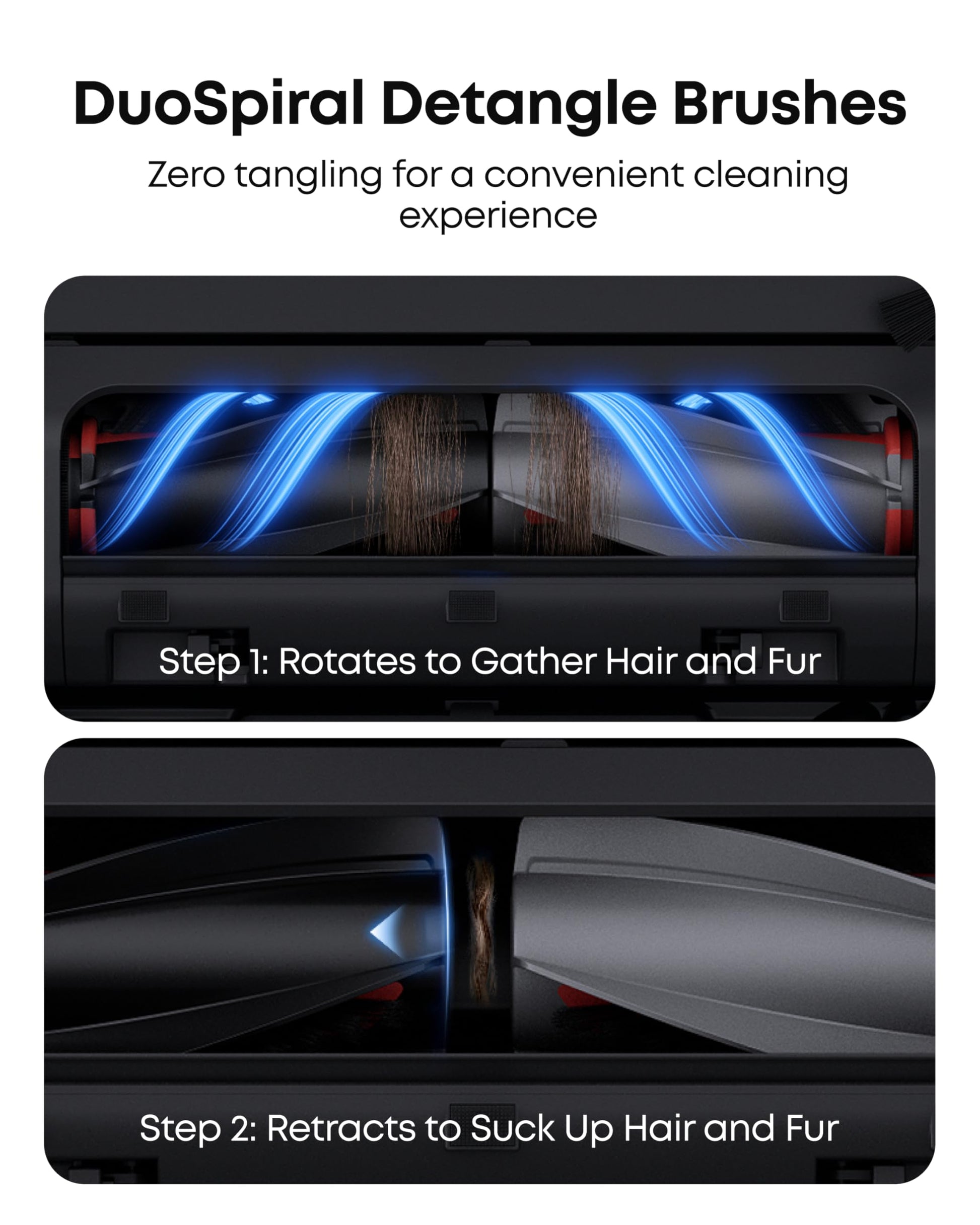 - Anti-Tangle DuoSpiral Brushes: Less Maintenance, No More Hair Wrap, Clogs, or Daily Brush Cleaning,providing a hassle-free cleaning experience.