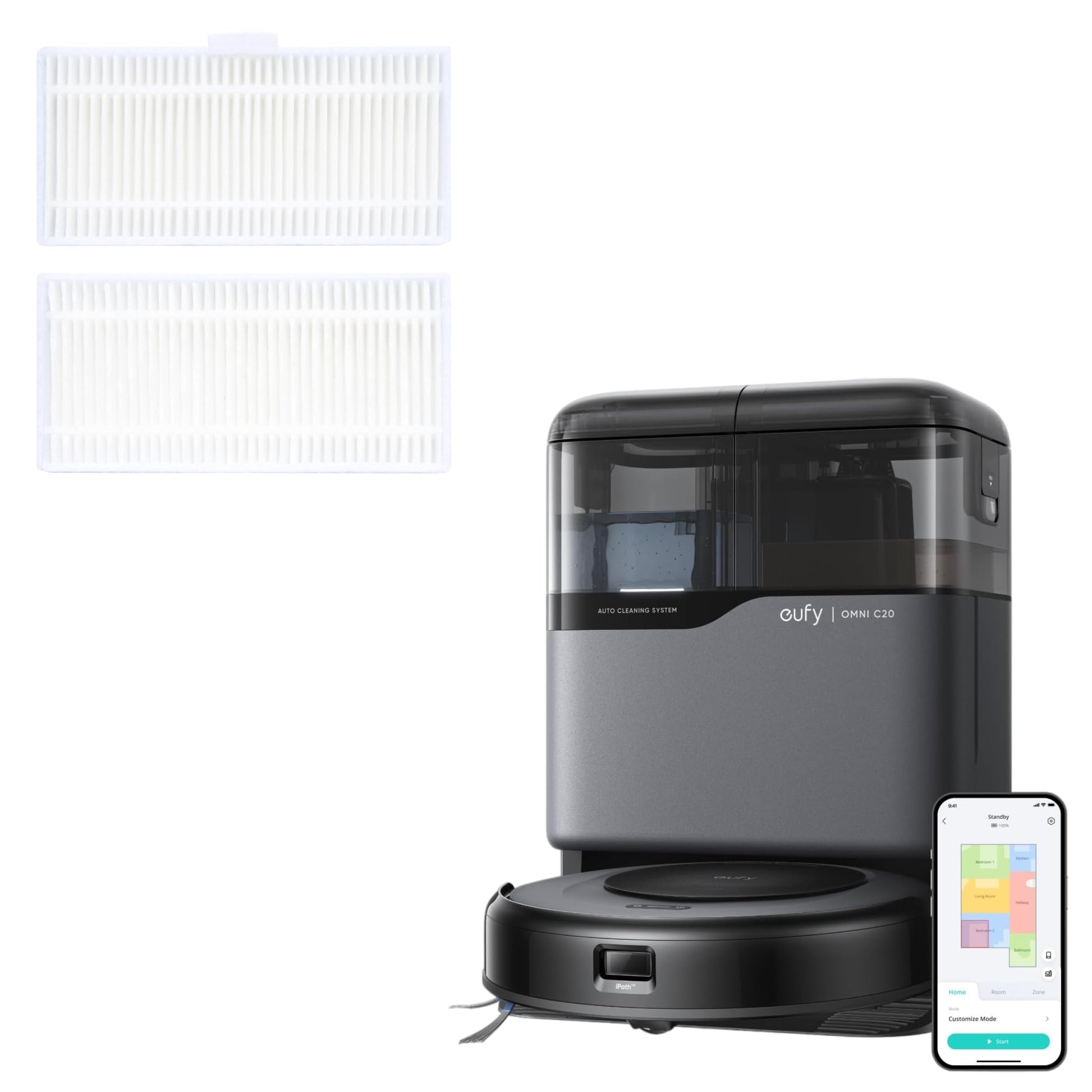 Details: eufy Robot Vacuum Omni C20 with All-in-One Station,3.35-Inch Ultra-Slim Body, and eufy Replacement Washable Filter for Robot Vacuum Omni C20, 2-Pack