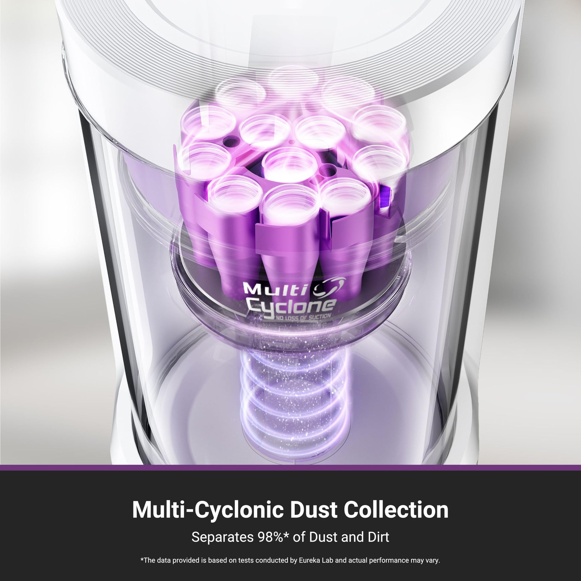 Eureka E20 Plus self-emptying robot vacuum cleaner comes equipped with a 13-cone structure, multi-cyclonic separation technology combines with powerful centrifugal force, generated by the suction during dust collection, to separate 98%* of dust and dirt before they reach the filter.