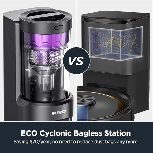 - Multi-Cyclonic&HEPA Filter:Eureka E10s self-emptying robot vacuum cleaner comes equipped with a HEPA filter that creates a cleaner and healthier environment for you and your loved ones, while the Multi-Cyclonic separation technology reduces impurities on the cartridge and extending the filter's lifespan.