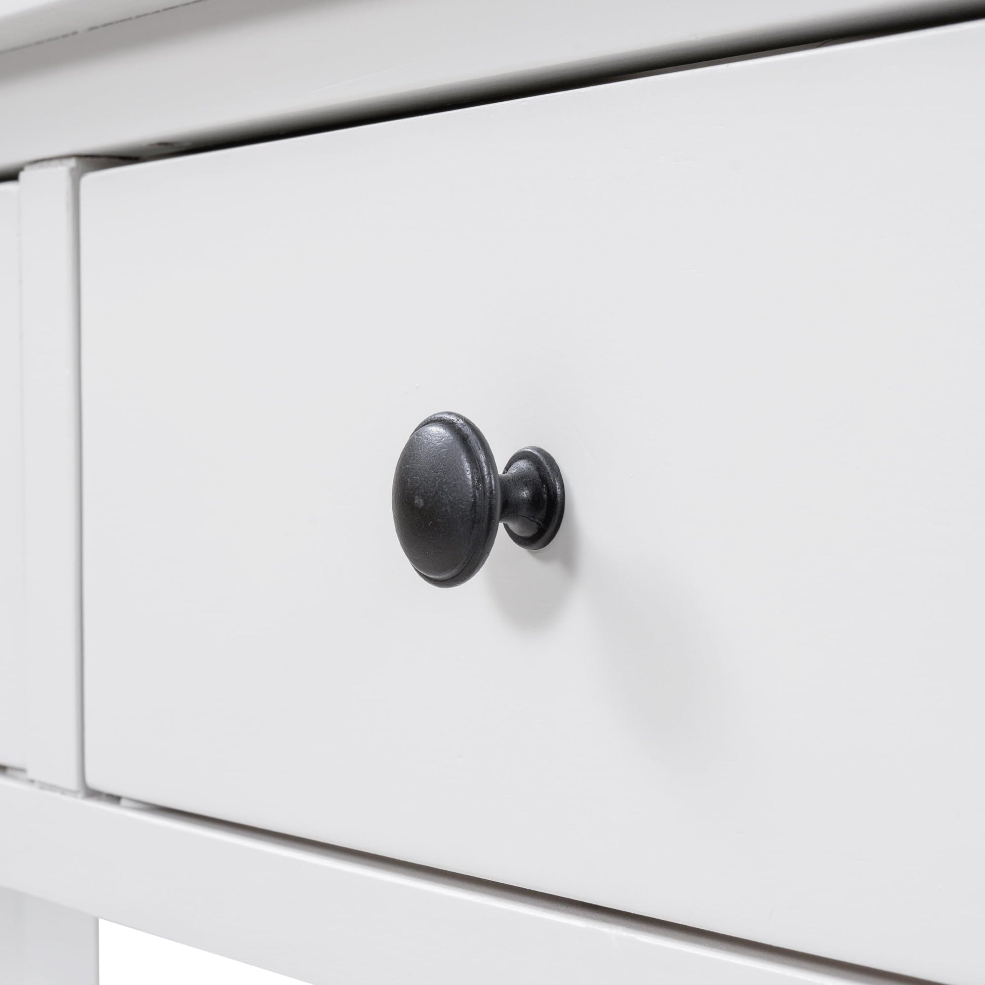 This Retro Design Console Table blends mid-century style with modern functionality. Perfect for the living room, this table features a solid pine wood frame and legs, offering durability and stability. With three drawers and two open shelves, it provides ample storage for daily necessities, ensuring a clean and organized space. The antique white finish complements any decor, making it a versatile addition to any home. Classic design with clean lines and circular handles, adding a retro touch to your home.