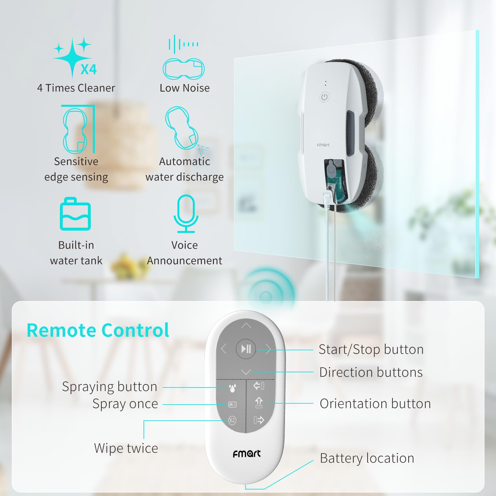 FMART T9Pro Window Cleaning Robot, Ultrasonic Atomization Intelligent Water Spray, 3800PA Suction Power, AI Intelligent Path Planning, Edge Detection Technology, Remote Control Robot Window Cleaner