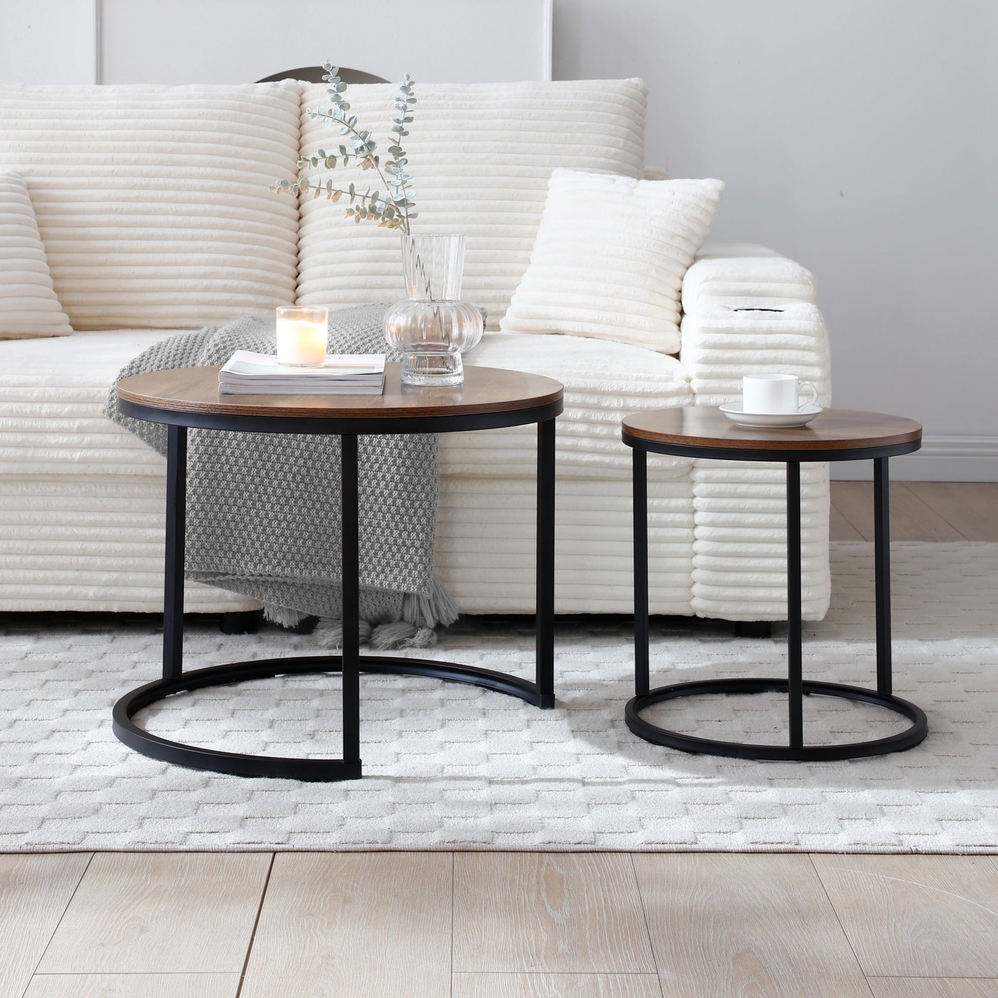 Add flexible function and modern style to your space with the Funnil Nesting Coffee Table Set of 2. These round wooden coffee tables can be used together or separately, offering versatile use in your living room, bedroom, office, or balcony. Crafted from durable MDF wood and supported by a sturdy metal frame, each table features a warm brown finish that complements any interior decor. Their space-saving nesting design makes them ideal for small spaces, while their clean, minimalist look enhances both modern and classic settings. Perfect as a coffee table, side table, or accent piece.