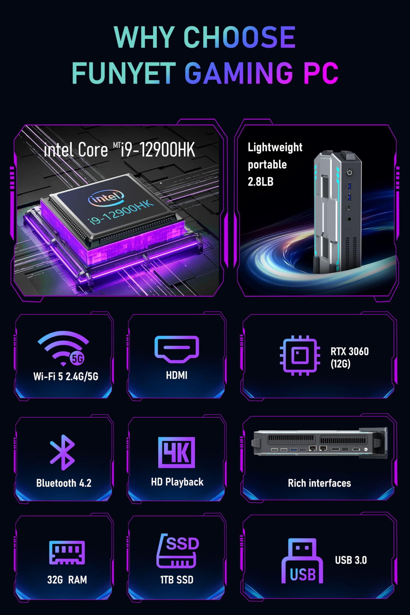 FUNYET Mini PC Gaming PC,Desktop Computer,Intel i9-12900HK Processor 14 Cores 20 Threads (up to 5GHz),RTX 3060 12G Mini Tower Computer,32GB RAM 1TB SSD,Support 4K Display, Dual LAN,WiFi 5,BT 4.2,RGB