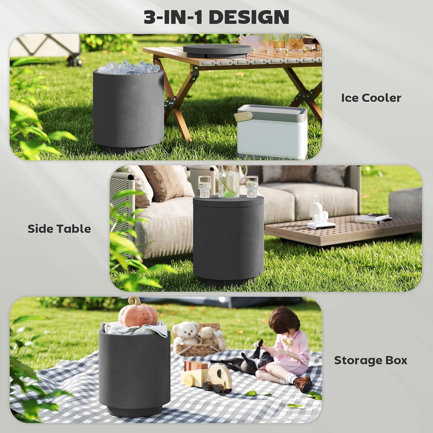 GaoJ 2.6 Gal Outdoor Cooler Side Table, 3-in-1 Cool Coffee Table with Storage, Removable Ice Bucket and Lid, Concrete Small Patio Table for Party, Poolside, Deck, Charcoal Gray