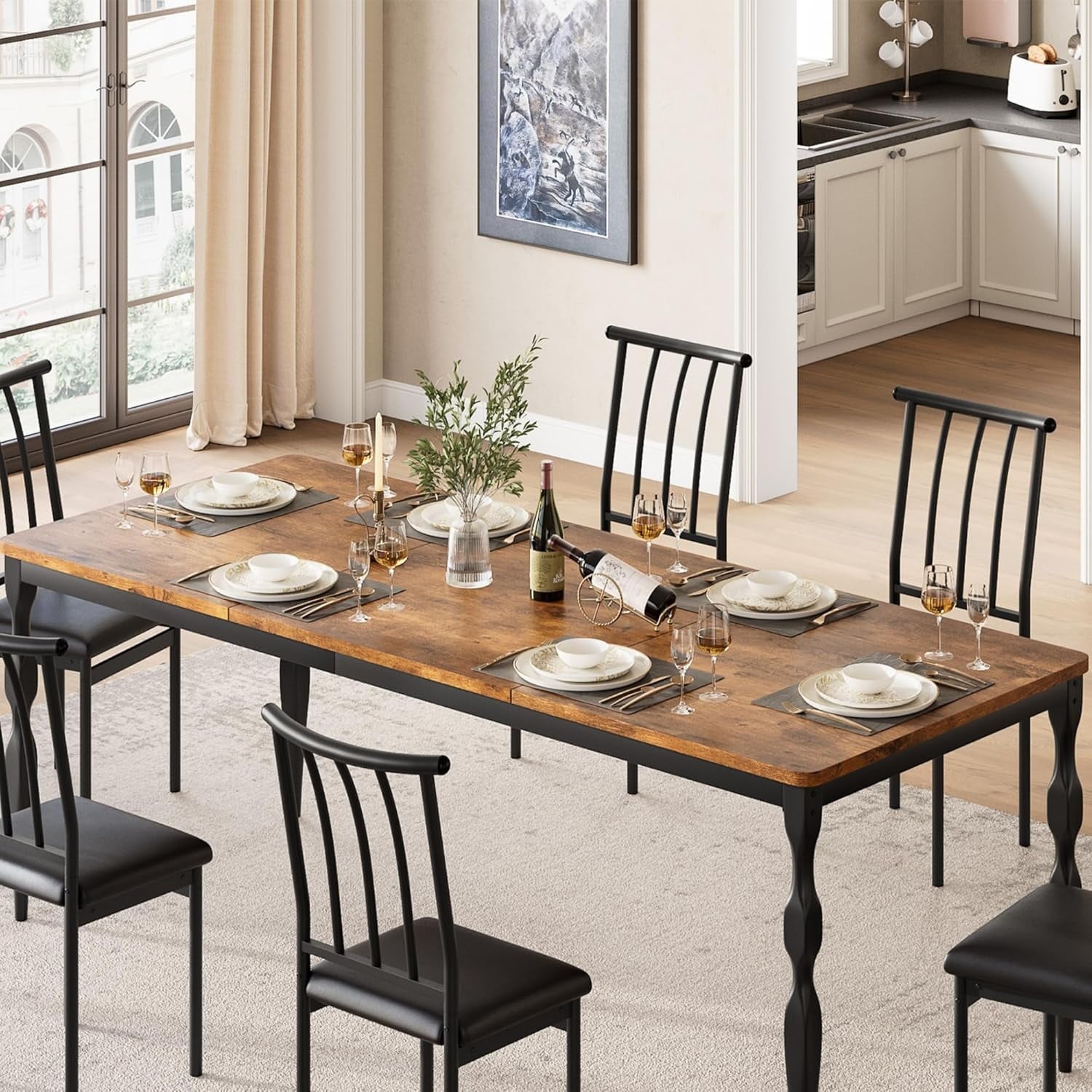 This spacious, extra-long dining table (70.9' W x 29.9' D x 35.4' H) comfortably seats 4 to 8 people, perfect for family meals or gatherings. With a height 5 inches taller than standard tables, it provides extra legroom for a more comfortable dining experience. Crafted from durable particle board and supported by rust-proof, powder-coated steel legs, it offers both stability and long-lasting performance, supporting up to 176 lbs. The vintage, curved metal legs add an elegant, artistic touch while maintaining strength and support. This versatile table is suitable for both indoor and outdoor use, ideal for dinner parties, board games, or working from home. Easy assembly with clearly labeled parts ensures a quick setup, even for first-timers.