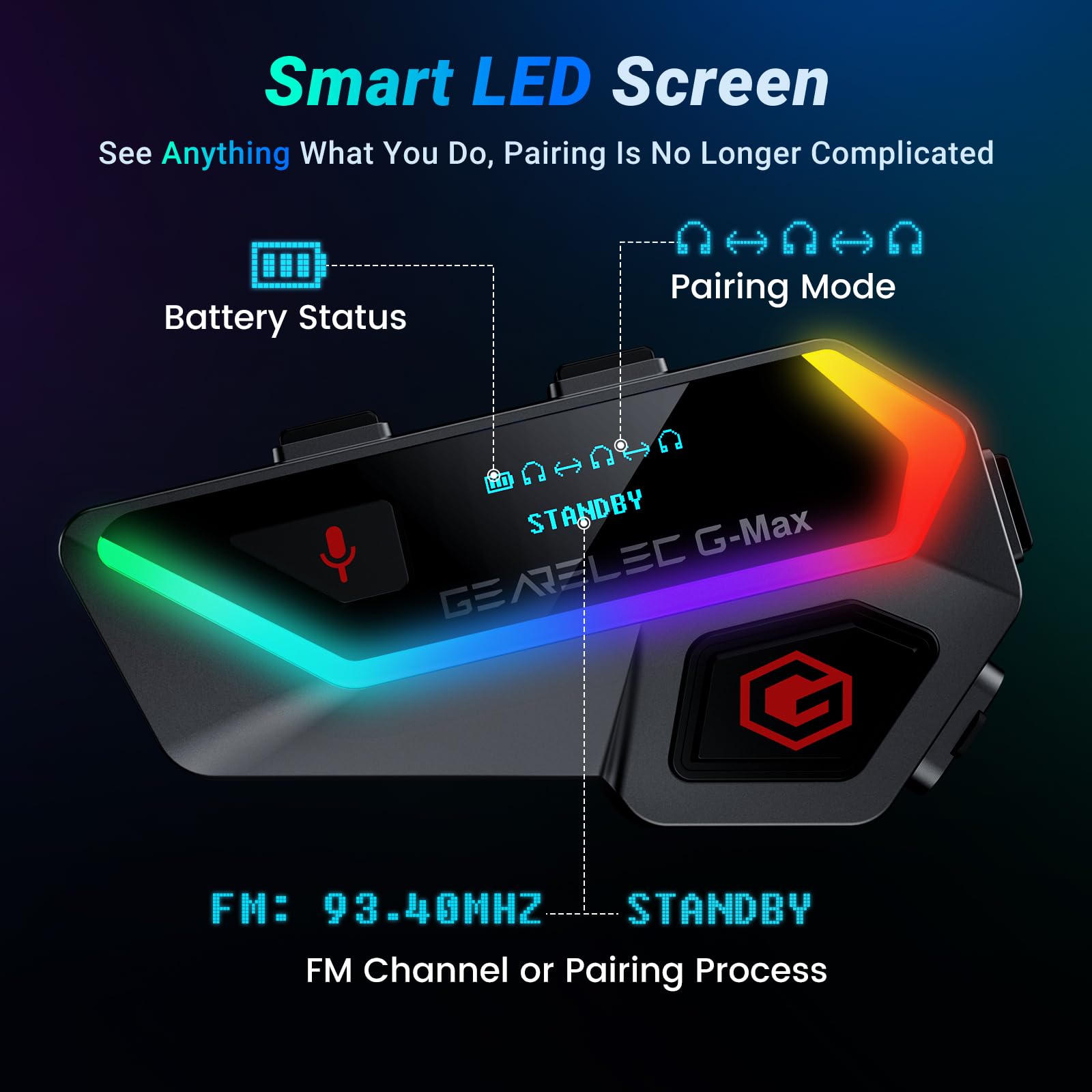 gearelec Motorcycle Helmet Bluetooth Headset V5.2BTใHiFi Stereo SoundใใScreen and RGB Lightsใ 80Mph Clear Calls Helmet Communication Systems 2000M 6 Riders Intercomunicador para Casco De Moto 2 Pack