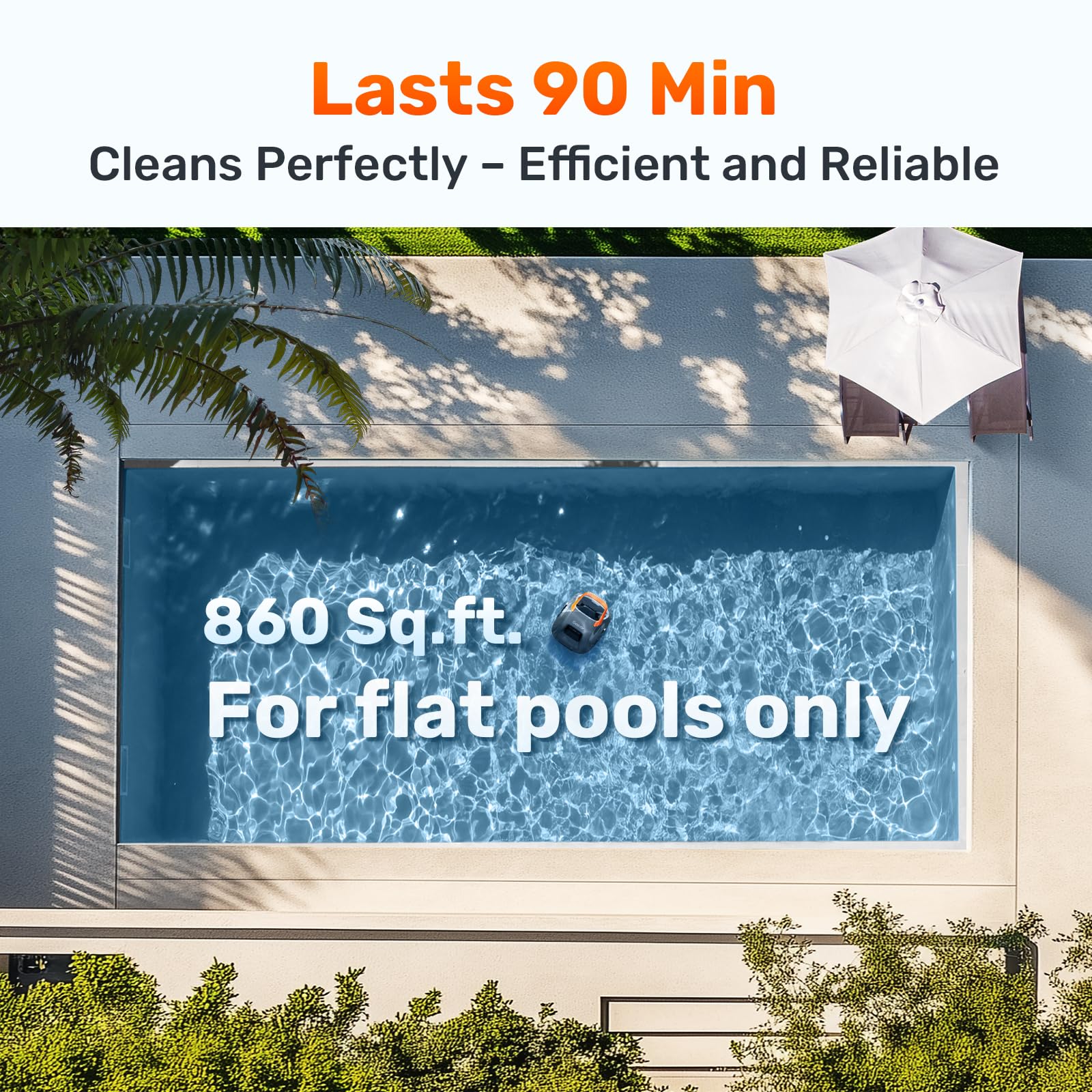 - Smooth Glide, High-Efficiency: This robotic pool cleaner runs for up to 90 minutes of continuous cleaning. Ideal for flat above-ground pools up to 860 sq. ft. Note:Only applicable to flat above-ground pools.