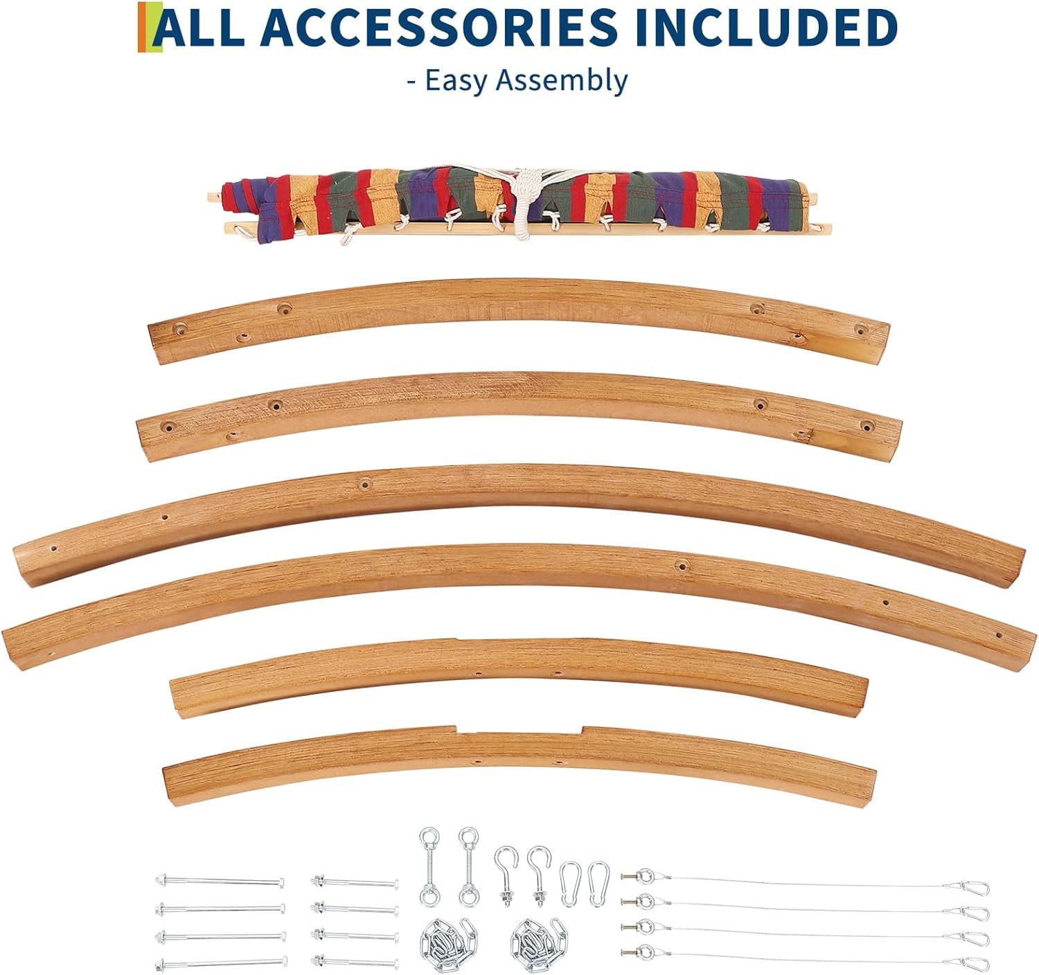 - Curved Design: Our curved outdoor hammock embraces the extraordinary! Made of classic wood and soft cotton in a sleek, modern design, the wooden hammock stand is a visual treat that effortlessly blends bohemian chic with modern elegance.