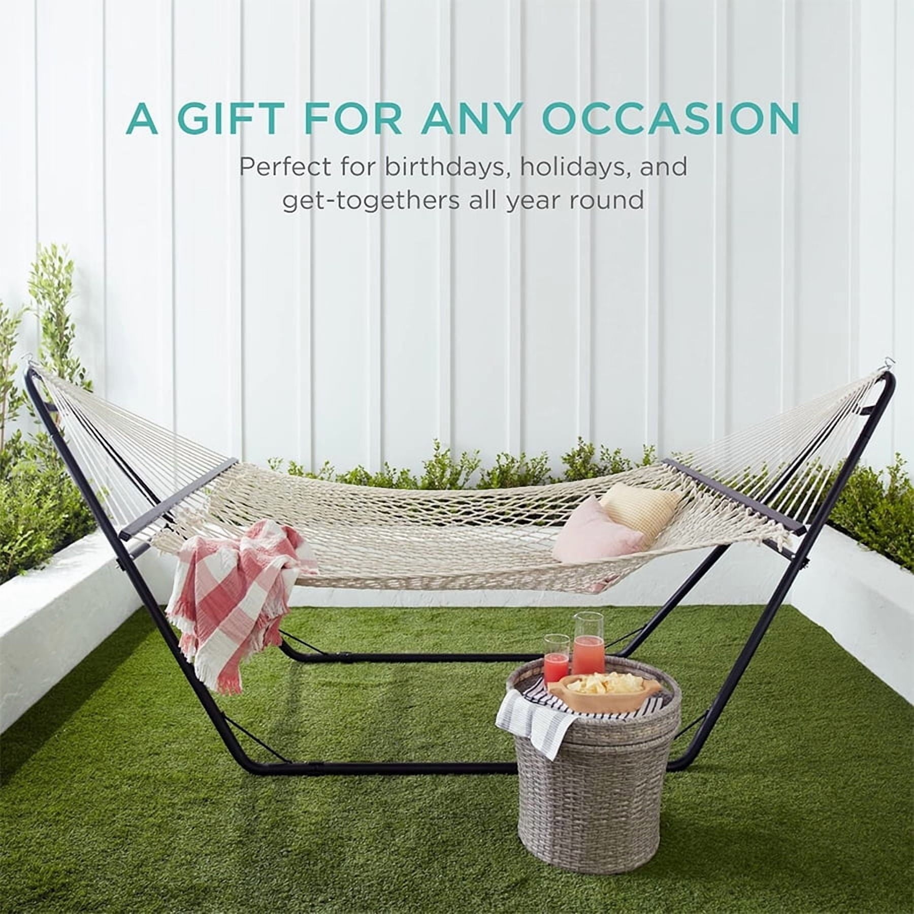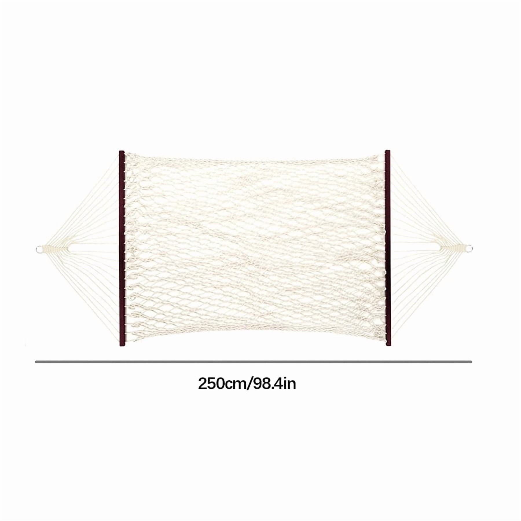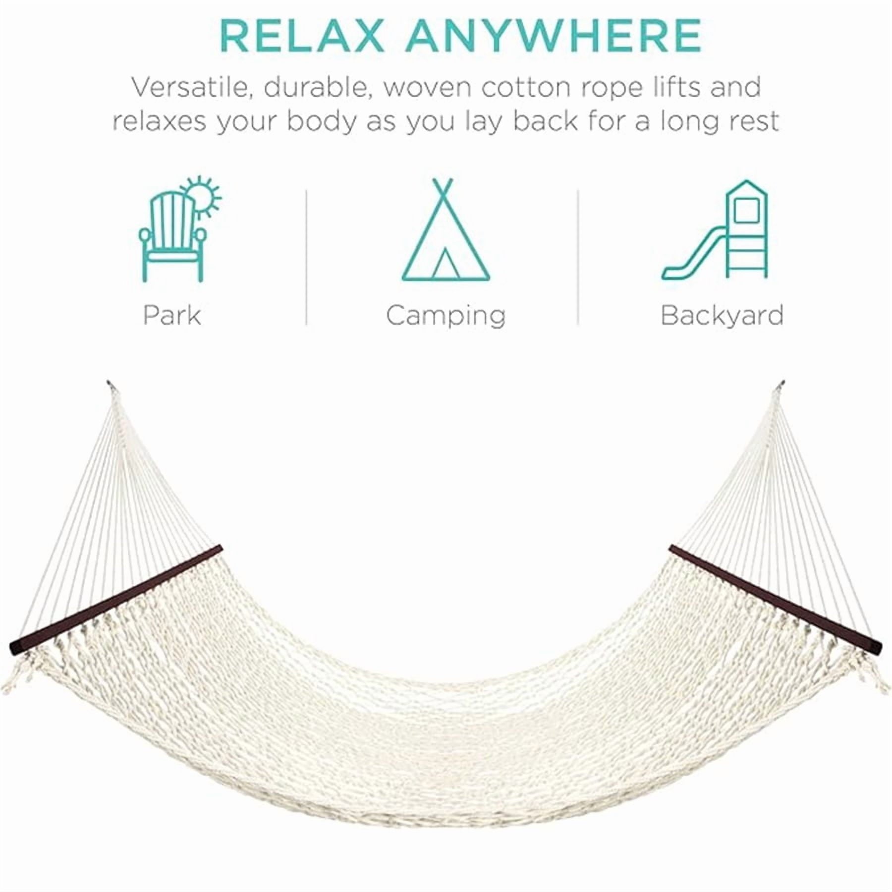 Spacious Double Hammock: With room for two people and up to 450 pounds, you can relax with friends and family, or snuggle with your petsRelaxation Setup: Elevating your body and lying flat can help relieve stress, while the tight 'eye' weave pattern encourages airflow and improves blood circulation throughout the bodyLong-Lasting Comfort: Extra-thick twisted cotton with finished hardwood poles and reinforced metal rings create a long-lasting and comfortable relaxation solutionComfort on the Go: Carrying case with handles allows you to easily store the hammock and take it to the beach, park, or vacation!The Ultimate Gift: Whether it's a friend or family member, this hammock is a fun and unique way to give them a new experience in comfort and quality