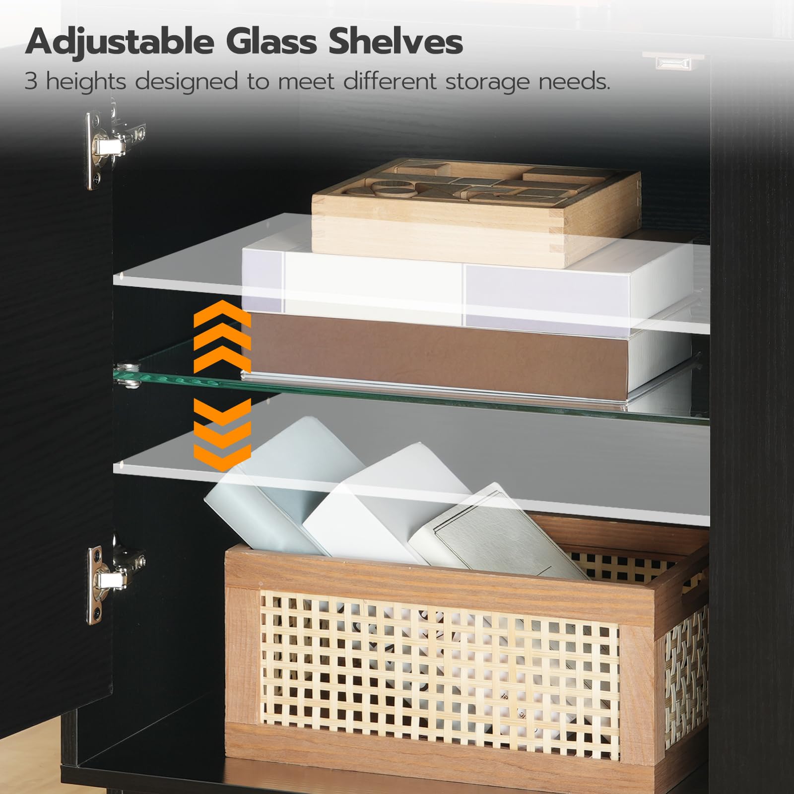 - Adjustable and Spacious: The fireplace entertainment center consists of 2 cabinets, 3 compartments, and 1 wide top, enough for open and hidden storage needs. The glass shelves in the cabinets can be adjusted to 3 heights to easily organize various items