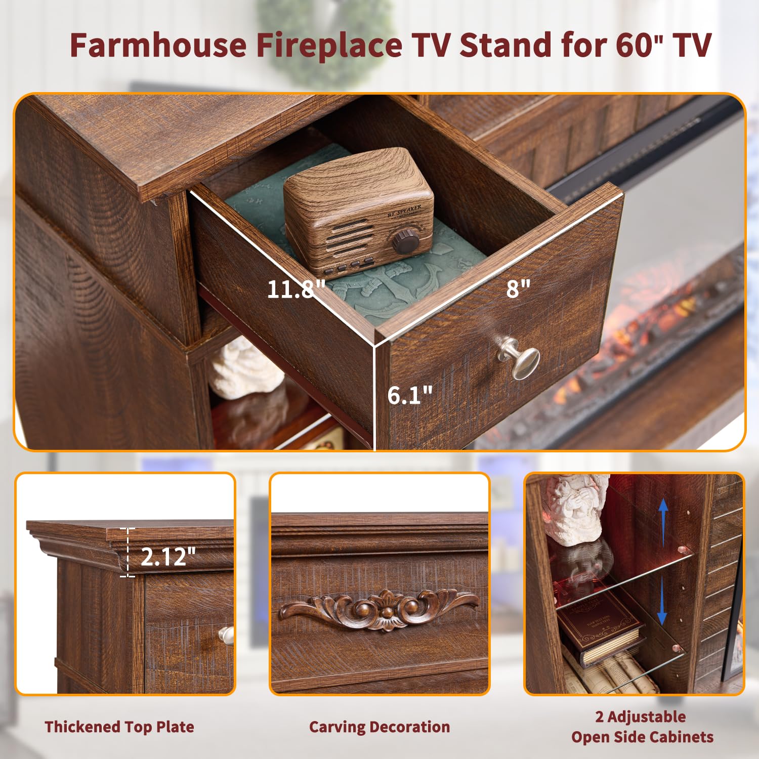 IFBUY 54" Farmhouse Electric Fireplace TV Stand for 60 Inch TV, 33" Tall LED Entertainment Center w/7 Color, Open Adjustable Shelves & Drawers, 23'' Fireplace Insert Heater for Living Room, Brown