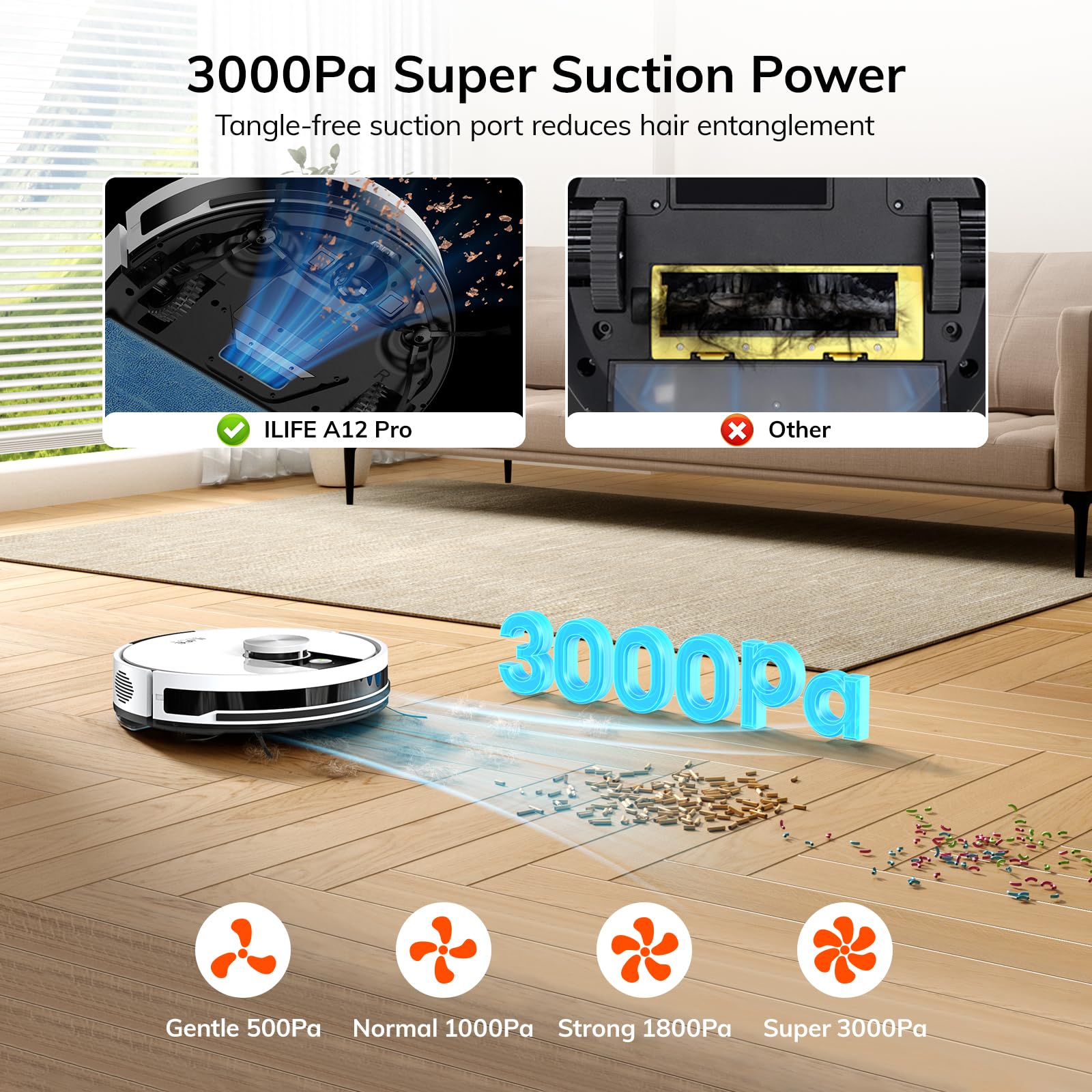- Powerful 3000Pa Suction for Deep Cleaning: With 3000Pa maximum suction power, A12 Pro robot vacuum effortlessly picks up dirt, debris and pet hair from hard floors, carpets and other surfaces. You can choose among four suction modes for cleaning: Quiet (500Pa), Standard (1000Pa), Strong (1500Pa), and Max (3000Pa)
