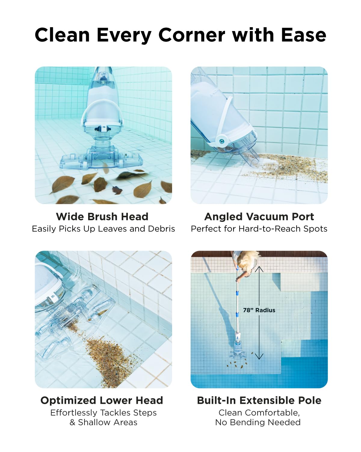 - [Adapts to Any Pool Type] The dual-mode brush head is perfect for both shallow steps and deep ends of inground pools, while also navigating tight corners in above ground pools. With a built-in extendable pole, you can clean up to 78” radius without bending. One tool, total coverage—no matter if it's an above ground pool or inground pool.