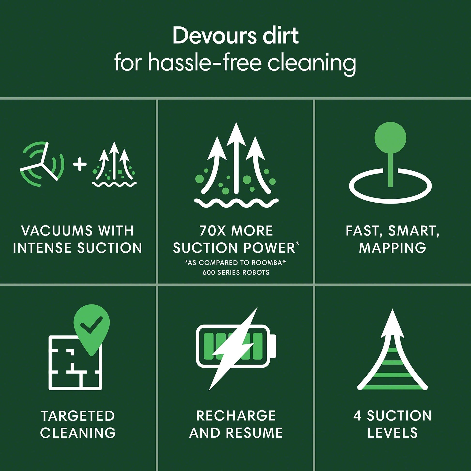 - DEVOURS DIRT WITH 70X MORE POWER-LIFTING SUCTION*. 3-Stage Cleaning includes 70X more power-lifting suction*, a Multi-Surface brush, and Edge-Sweeping brush to devour dirt and dust bunnies and leave floors barefoot clean. *As compared to Roomba 600 series robots