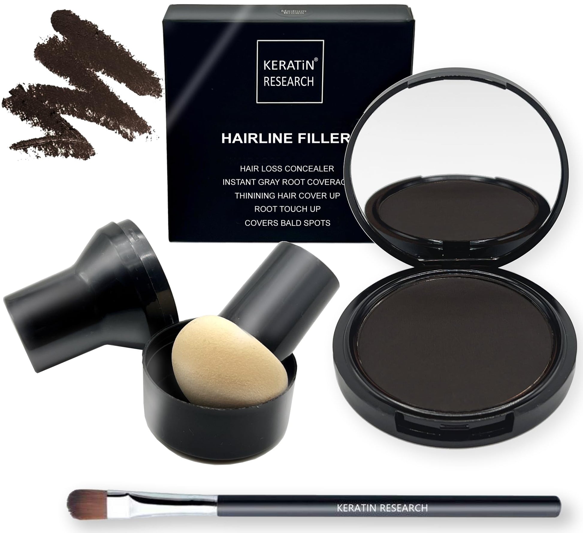 - ROOT CONCEALER- Keratin Research Hairline Filler, a Premium Root Cover Up, is your secret weapon for at home or on-the-go. Camouflage roots and grays instantly, giving you full great looking hair! The Cover Up Powder also conceals thinning hair and hair loss, for an instant look of healthy volume. Packaging includes a large mirror and a great mushroom applicator. Root touch up powder is resistant to rain, sweat, and wind.
