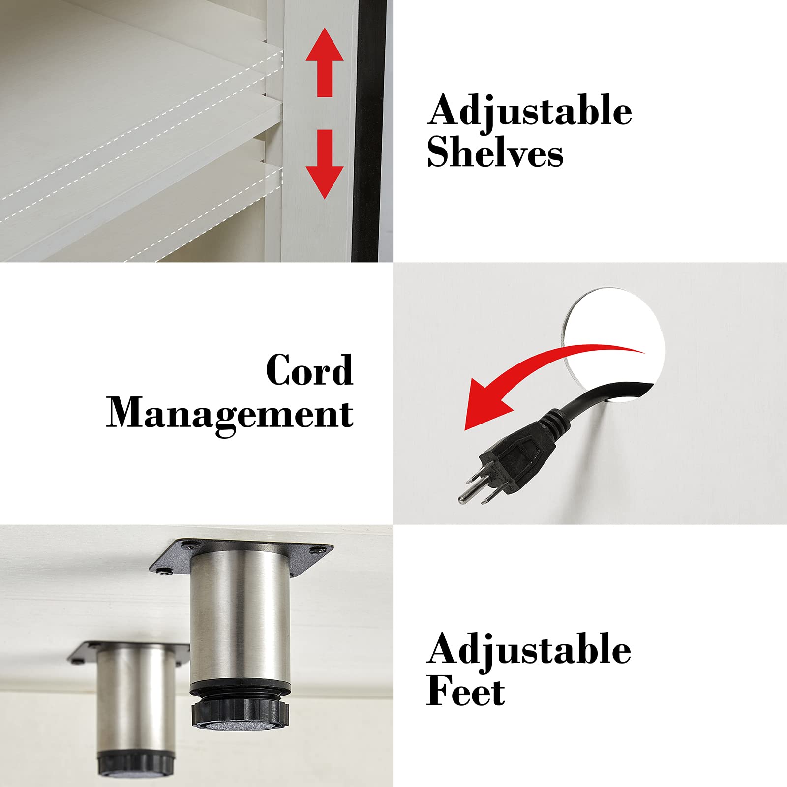 - Storage Space: Larger tabletop and open storage shelves, 2 closed glass storage cabinets with adjustable shelves. Cable management on the back keeps cords organized. Can be used as a TV cabinet or a storage cabinet.